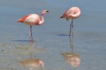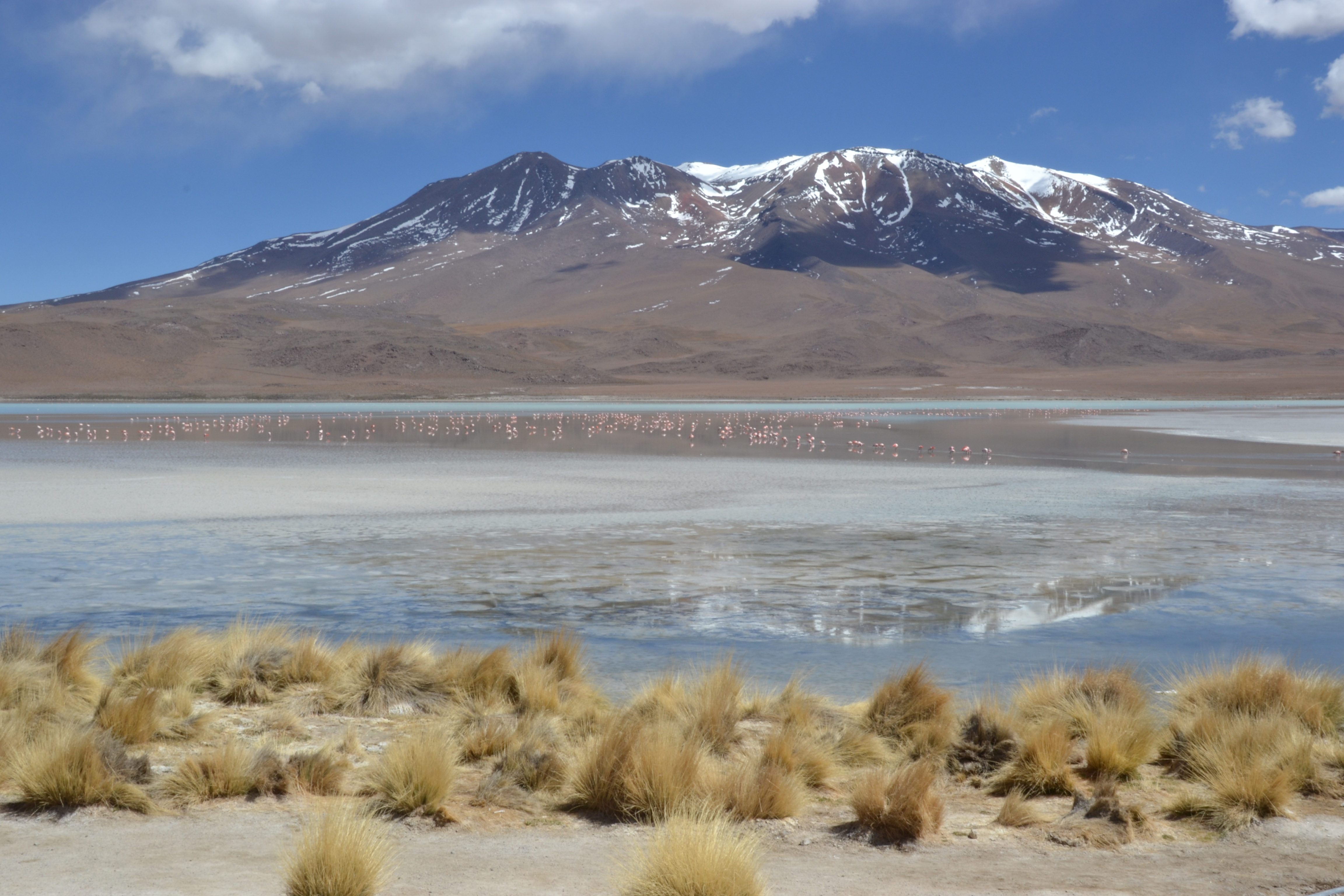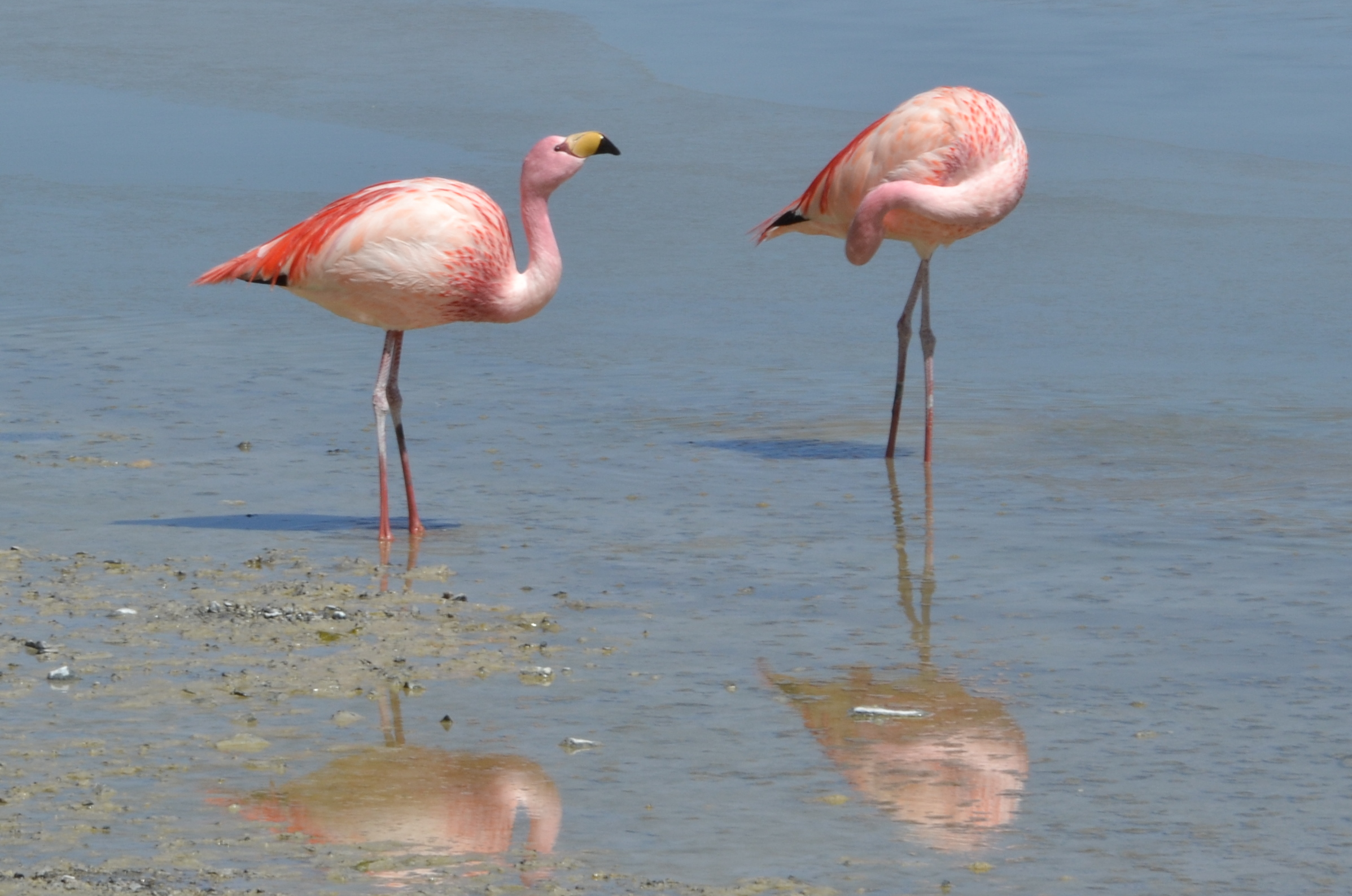 Op zondag 25/9 vertrekken we van ons prachtige kampeerplekje tussen de rode rotsen richting het merengebied van Bolivia. Dit is een stuk hoogvlakte (tussen 4 en 5000 meter) met een flink aantal zoutmeren erin. Er loopt een weg dwars doorheen: La Ruta de las Joyas (de juwelenroute). Deze route wordt vooral afgelegd door toergroepen die in een Toyota Landcruiser in 2 of 3 dagen door het gebied worden gesjeesd van San Pedro de Atacama (Chili) naar Uyuni (Bolivia). Als we op pad gaan komen we ze al snel tegen. We rijden er eerst achteraan, maar dan blijkt dat ze een iets andere route volgen. Joost houdt een auto aan en die wijst ons de weg naar de meren. De strak geasfalteerde weg wordt al snel een heftig keienpad en over de eerste heuvel zien we het eerste zoutmeer liggen: Laguna Canapa. Helaas ligt hier veel afval. We zien 4 Fransen die in een gehuurde Toyota Hilux het gebied doorrijden, zo kan het ook. Iets verder komen we bij Laguna Hedionda. Hier zit een flinke kolonie flamingo’s (2 soorten). Flamingo’s?! Jazeker, die vogels houden het prima uit in deze lage temperatuur en hebben een speciale spijsvertering waardoor ze uit het zilte water hun voedsel kunnen halen. Een prachtig gezicht. Het meer wordt omgeven door hoge besneeuwde toppen. Joost maakt een 360⁰ filmpje -> filmpje You Tube. Ik ga even plassen bij het ecohotel en moet daarvoor 5 Bol afrekenen! Heel eco dus.