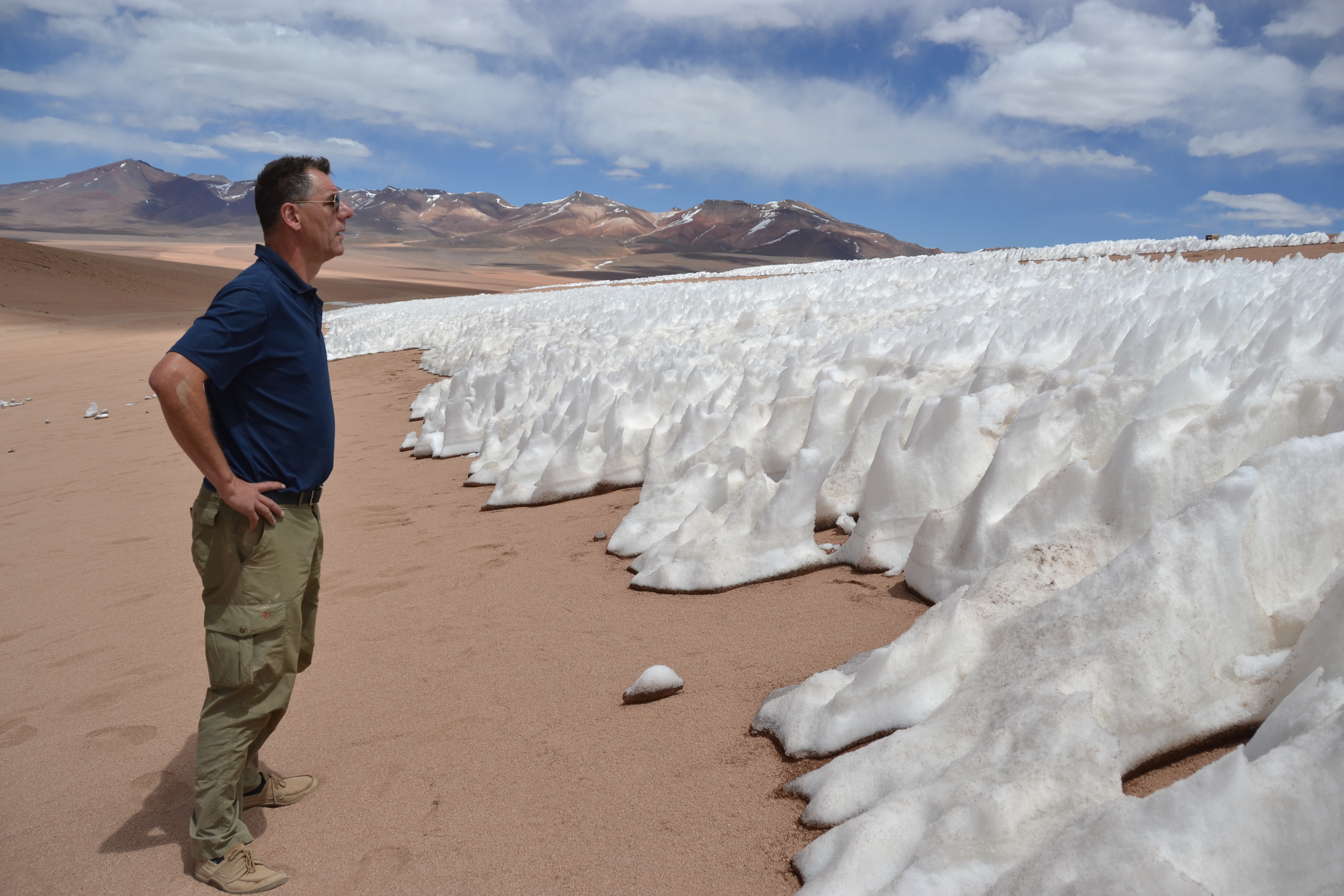 uit. De hoogvlakte lijkt een soort woestijn met lava-gravel en je kunt rijden waar je wilt met flinke snelheden -> filmpje You Tube. Aan de rand zien we merkwaardige ijspegels uit het zand steken; hier is de sneeuw zodanig weggesmolten dat er pegels overblijven, prachtig. We lunchen bij een rotsformatie. In de zon is het lekker warm.