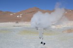 ’s Ochtends om 5 uur vertrekken de eerste groepen, maar wij komen er pas uit als de warme zon schijnt. De waterkraan is weer bevroren, maar we hebben prima warm geslapen. Er is nog 1 groep aan het ontbijten en de lange Uruguayaan vraagt of ik een thermometer heb. Even later blijkt hij een temperatuur te hebben van 37,2 graden en ik probeer hem aan het verstand te peuteren dat hij last heeft van de hoogte. Als ze op het punt staan te vertrekken vraag ik hem of hij genoeg water heeft. Ach, dat gaat hij zo wel kopen. Kopen?! Er is hier helemaal niets! Oen! We vullen de 5 liter fles van 2 meisjes bij en drukken ze op het hart dat hoogte geen grapje is en rare dingen met je lijf doet. Ach ja, zo zullen wel veel onnozele toeristen zich afvragen waarom ze zo’n hoofdpijn en luchtgebrek hebben. Weer rijden we door prachtige afwisselende landschappen en gaan kijken bij de Sol de manana geisers. Op diverse plekken komt ve