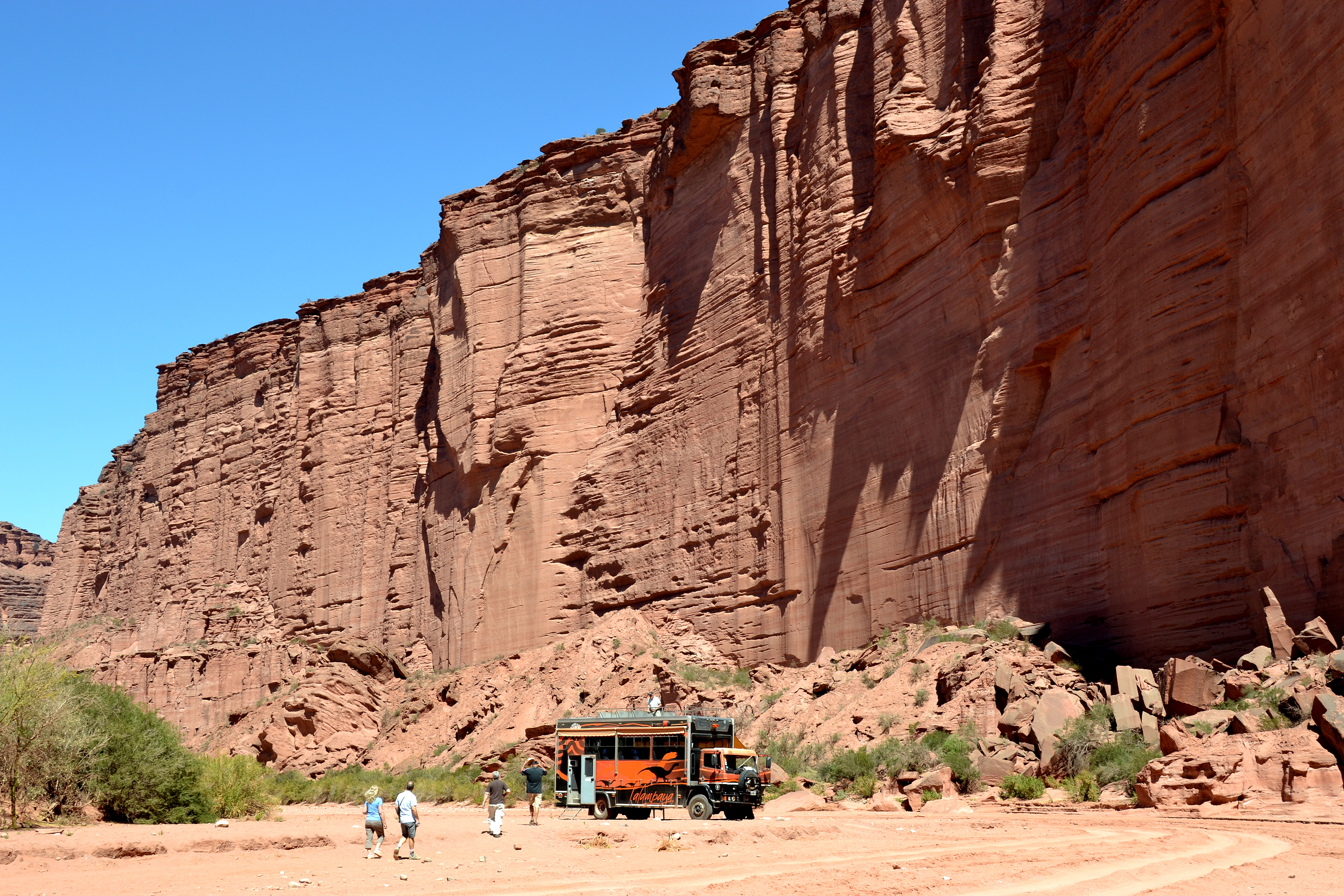 niet zo onder de indruk van de tekeningen. Nu mogen we bovenop de truck plaatsnemen en dat geeft een prima uitzicht. De volgende stop is midden in de Cañon de Talampaya. De rotsformaties zijn spectaculair steil en hoog en moeilijk te fotograferen. Op een bepaald punt (de “echo-schoorsteen”) laat de gids ons heel hard ¡Hola! roepen en dat echoot fantastisch heen en weer tussen de beide rotswanden. Intussen heeft de bemanning een tafel klaargezet onder een zonnescherm met drankjes en versnaperingen.