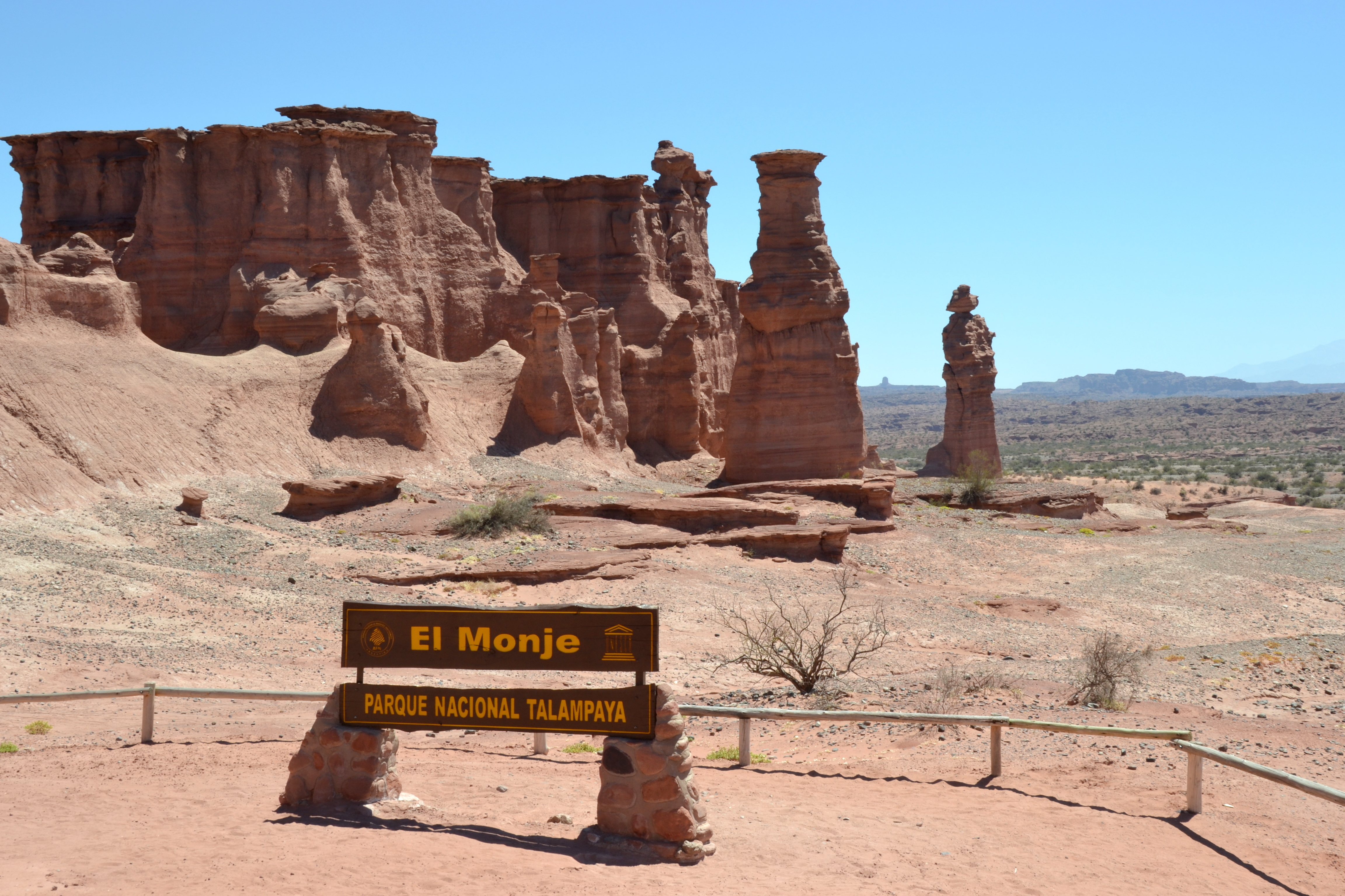 Op 4/10 rijden we verder via een nogal saai stuk van de Ruta 40 door woestijnachtig landschap met lage bosjes. Hier hebben we de iPod echt nodig voor wat afleiding. Leuk is wel het plaatsje Chilecito waar tot onze verbazing de gehele Plaza een WIFI-hotspot is. We kunnen geen goede supermarkt vinden en dus rijden we langs een groenteman en een enorme slagerij. Da’s apart boodschappen doen hier. Even later komen we weer bij een Control Fitosanitaria, waar ze rustig je (netgekochte) groenten en fruit in beslag nemen ter bescherming van lokale telers. Ik blijk glashard te kunnen liegen en heb inmiddels een truc gevonden. We bieden ze iets aan dat we in de koelkast hebben liggen (1 appel b.v. of een paar tomaten) en zeggen dan dat dat het enige is. Dat moeten we dan ter plekke opeten of inleveren. En hup, doorrijden maar. Onze auto is nu al een paar keer besproeid van onderen (desinfectie, ramen dicht!). Als we bijna bij Talampaya zijn, komen we twee Fransen tegen in een pickup-camper. We stoppen even om een praatje te maken. Het blijkt dat ze net in General Villa Belgrano hebben gestaan om een camping waar al een paar weken een paar Nederlanders staan. Het blijken Dirk en Marieken te zijn en Marieken heeft nogal last van haar reuma. Toch maar even een mailtje schrijven naar ze. Wat is de wereld toch klein. Aan het einde van de middag komen we aan bij Parque Nacional Talampaya aan. Jawel, alweer Unesco werelderfgoed. Je mag