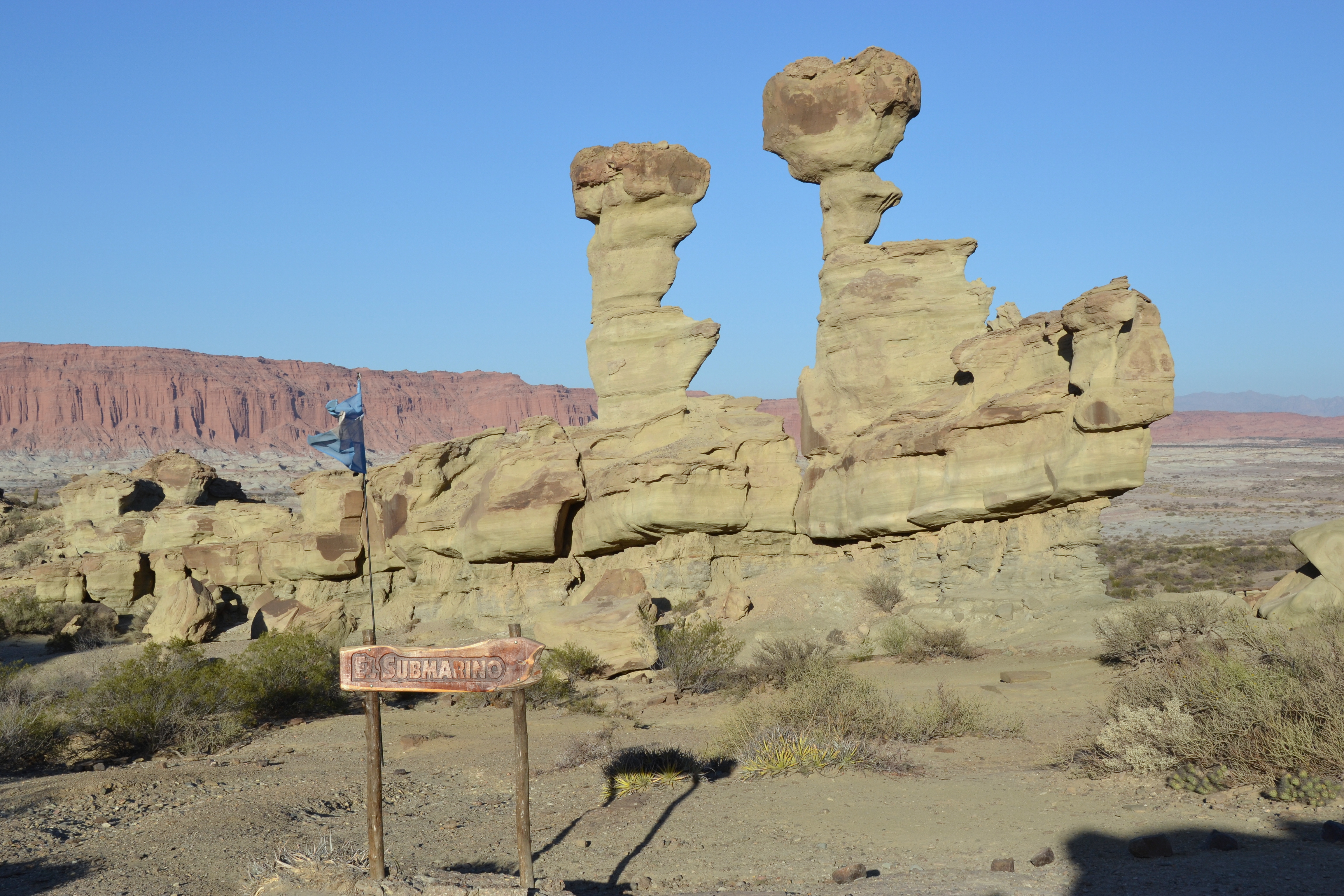 Het is al 18 uur als we bij het pronkstuk aankomen El submarino, een rots die lijkt op een onderzeeër. Dit is ook het moment dat de gids vol trots zijn lesboekje over de 5 geologische perioden laat zien en ons aanbeveelt. Verder is hij erg druk met het fotograferen van twee Argentijnse jongedames, van wie er één Duits