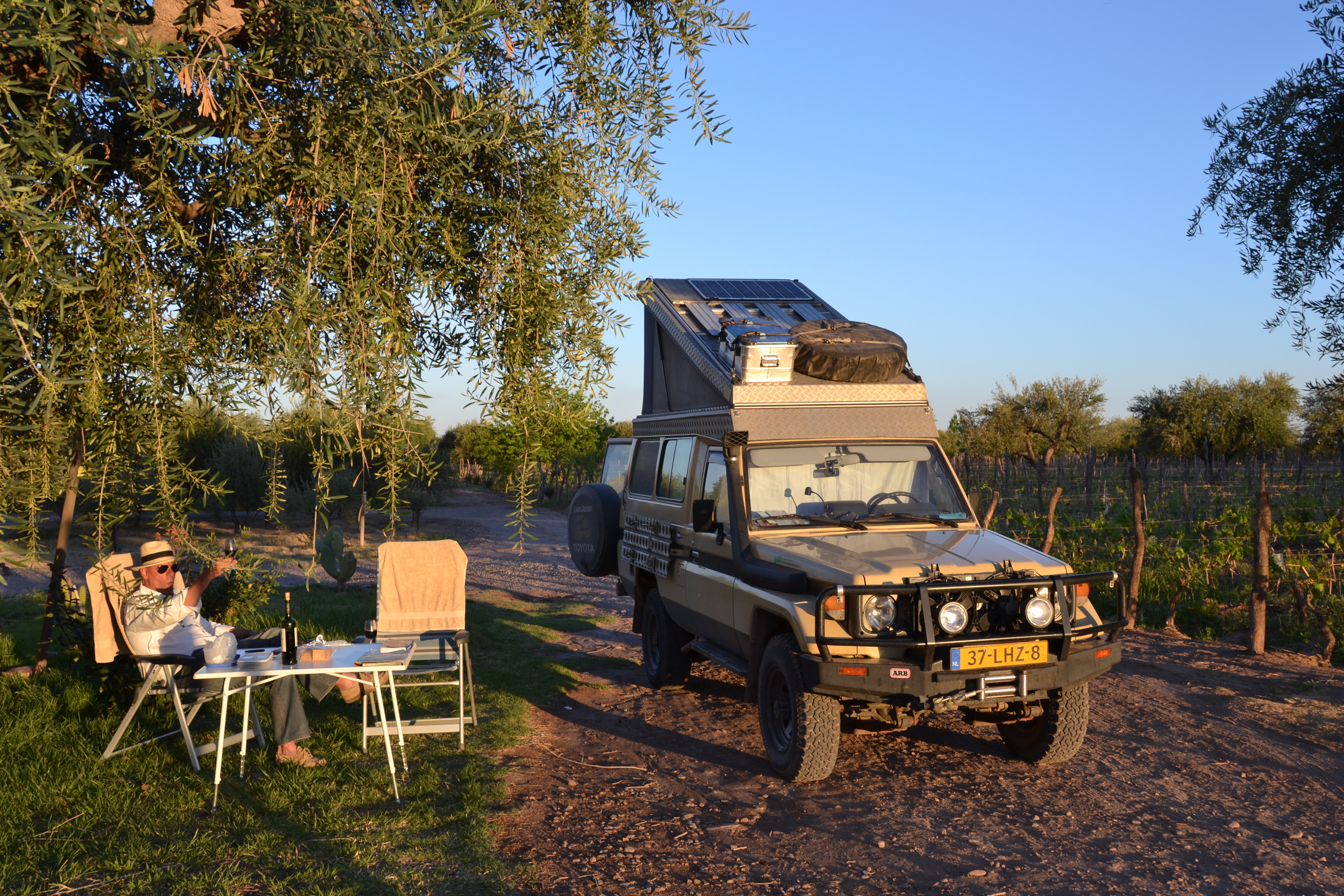 Donderdag 6/10 gaan we vroeg op pad en verlaten PN Ischigualasto. Het is 350 kilometer naar Mendoza en afhankelijk van de weg halen we dat wel (of niet). Het blijkt reuze mee te vallen. Na weer wat controles op groente en fruit rijden we valk voor Mendoza binnendoor langs vele adobe (modder) hutjes en kleine eenvoudige dorpjes. Het landschap lijkt in schril contrast met het imago van Mendoza met z’n groene wijngaarden. Mendoza is echter eigenlijk een woestijstadje, maar als je in de stad bent heb je geen idee daarvan. Overal groene bomen en heel veel water door kanaaltjes in de stad. We gaan op zoek naar eerst een supermarkt. Met de GPS vinden we een enorme Walmart en doen even heerlijk boodschappen. Vervolgens gaan we op zoek naar de camping municipal. In Argentinië vindt menig gemeente (groot maar ook heel klein) het nodig om een camping aan te leggen. Let wel, vooral om in de barbecuedrift van de Argentijnse bevolking te voorzien. Je betaalt een paar pesos en mag dan gebruik maken van een plek met barbecue en picknicktafel (en draait keiharde muziek). Het geheel wordt meestal niet erg schoon achtergelaten. Afijn, in het enorme stadspark Parque San Martin van Mendoza is zo’n camping. We worden niet erg enthousiast van de lege stoffige camping en zeker niet wanneer we de prijs horen: 110 AR$ (zeg maar 17,50 Euro, erg veel voor hier). Aangezien mijn GPS aangeeft dat er nog meer campings zijn, gaan we eerst nog “even” verder kijken. Ai, en dus rijden we 1 ½ uur dwars door de stad om er achter te komen dat de andere campings allemaal gesloten zijn. Terug naar San Martin dan maar. We zoeken een (redelijk) vlak plekje en worden ogenblikkelijk aangesproken door een Nederlandse vrouw. “Ah, ik zag een Nederlands kenteken!” Annemiek is een milieujurist van in de 50 en reist twee maanden alleen in een kleine camper van Rutasur. We pakken een glas wijn samen en het wordt al snel gezellig. Als we eindelijk willen gaan eten komen de bewoners van een Landrover met klapdak aan. Een jong Duits stel, opvallend hip gekleed, die al 7 maanden op reis zijn en ook vanalles te vertellen hebben. Om half 10 zijn we eindelijk zo ver dat we de biefstuk in de pan kunnen doen en een salade kunnen eten. Tjoe, vermoeiend maar wel heel gezellig.