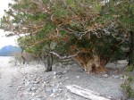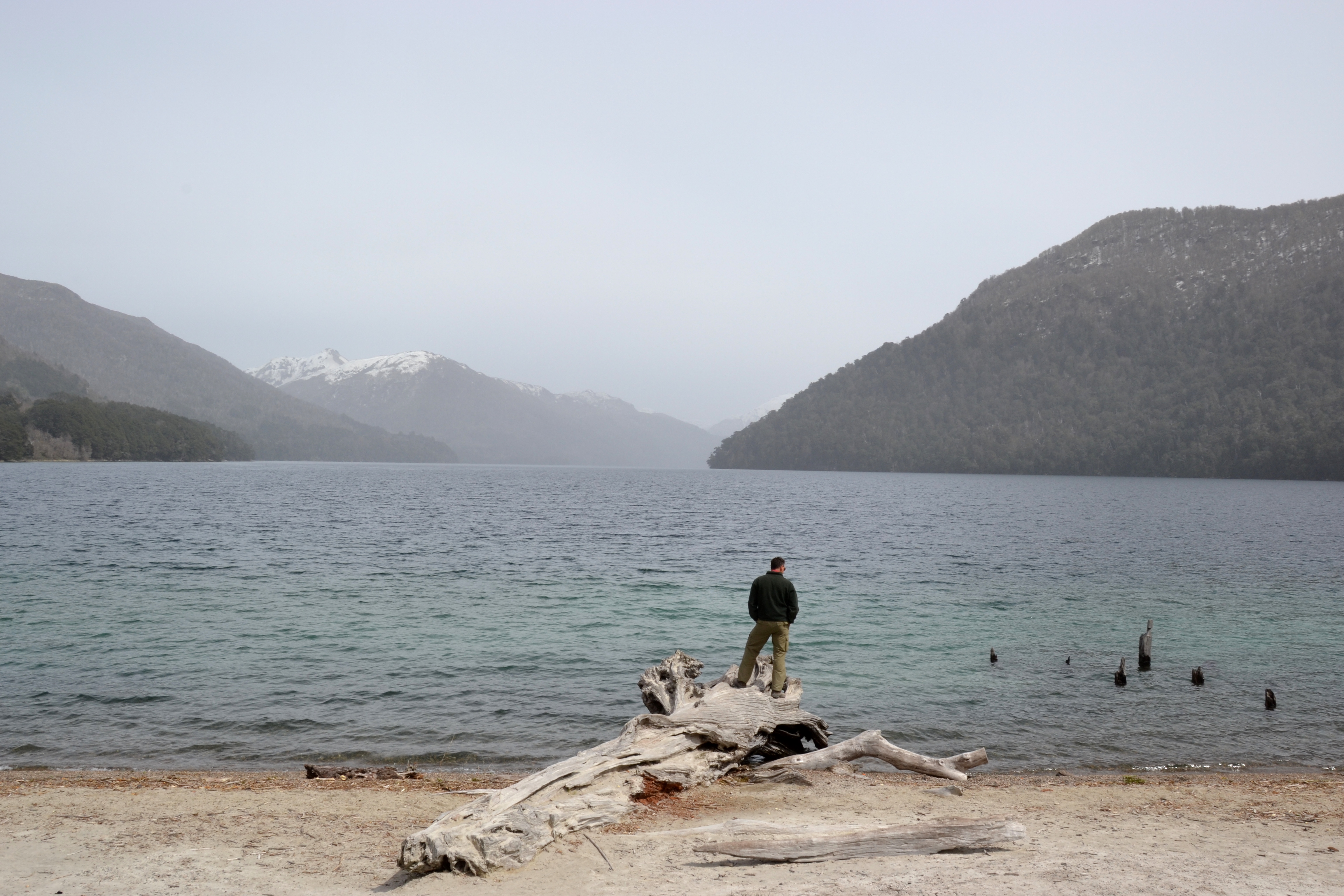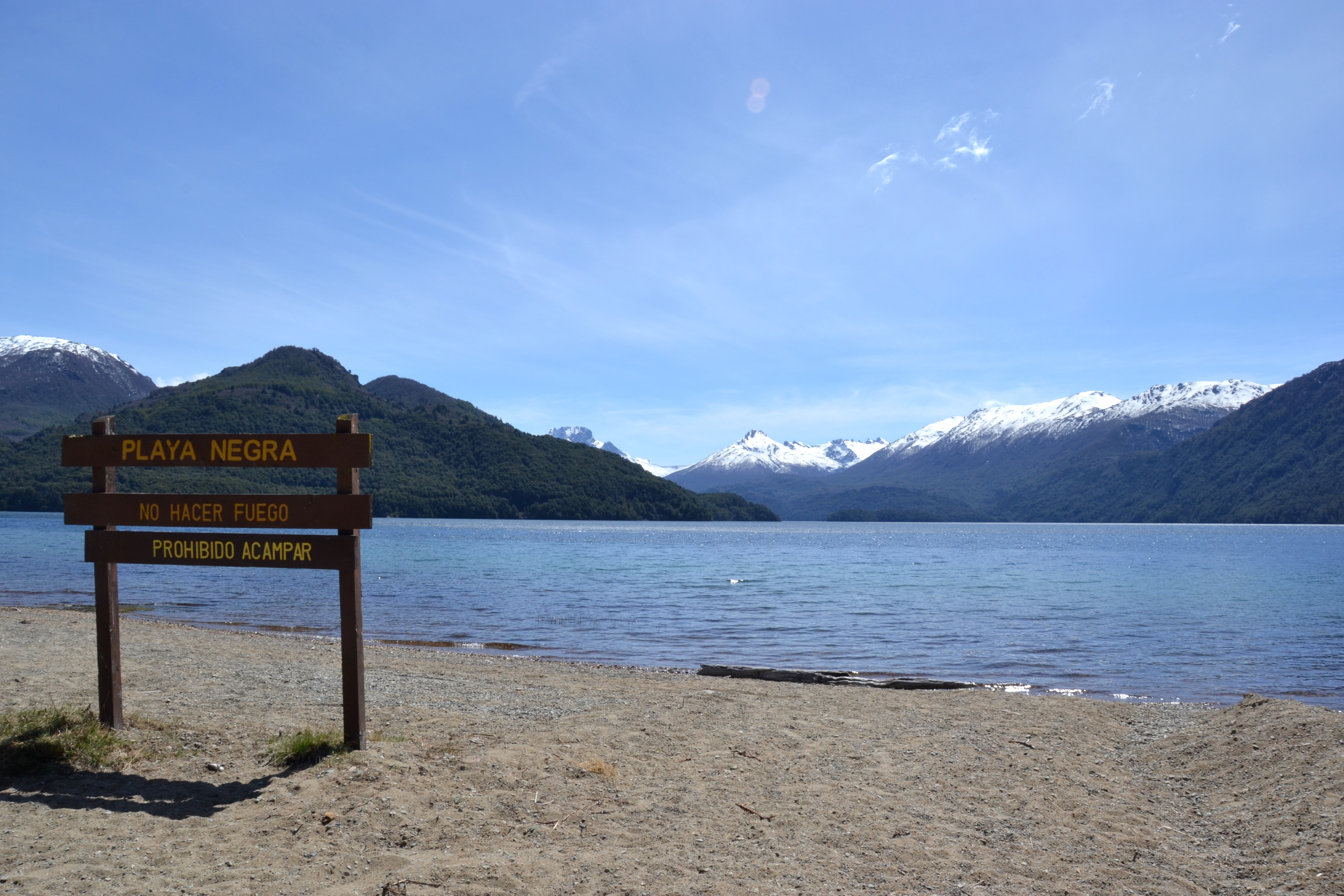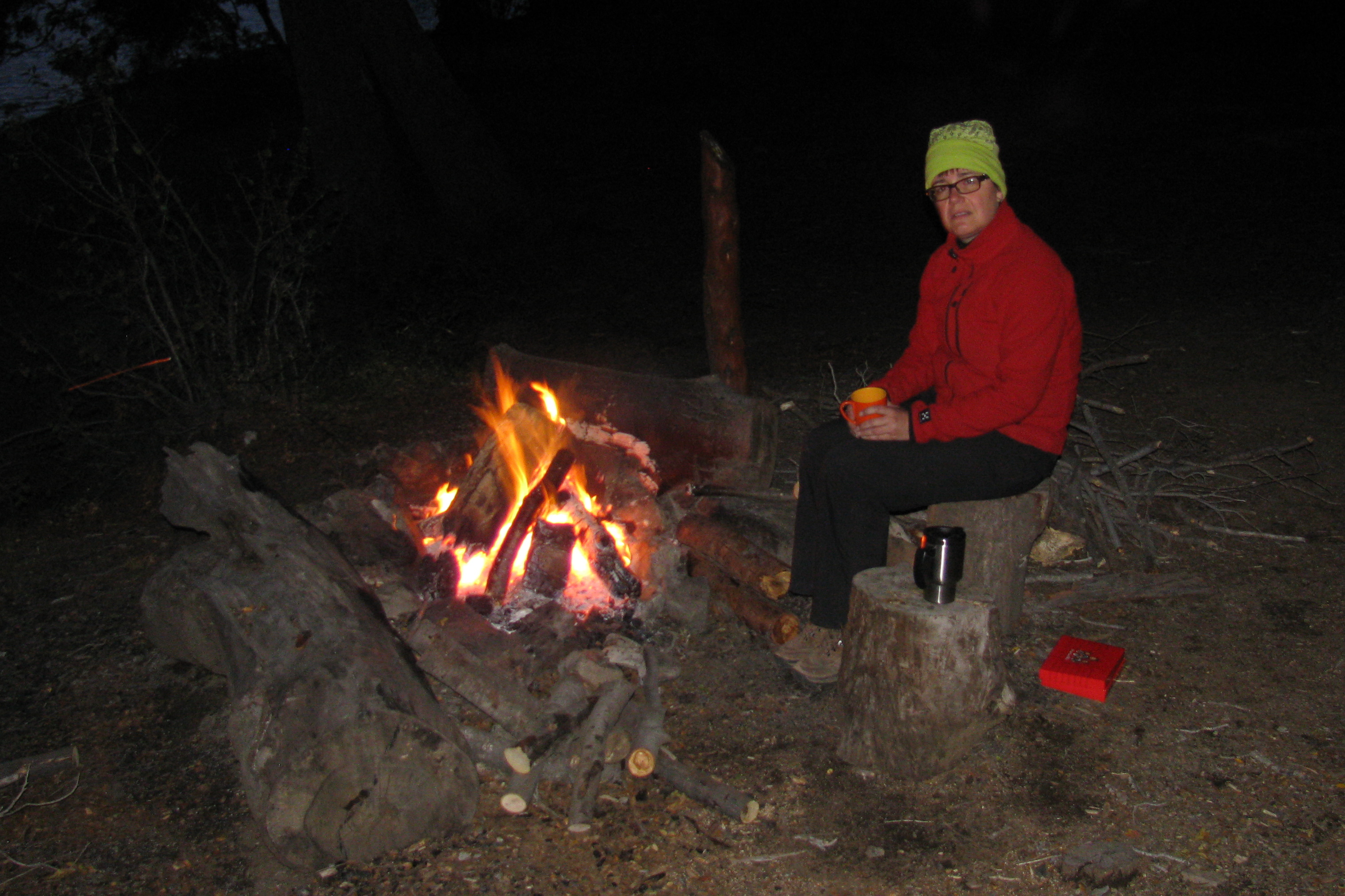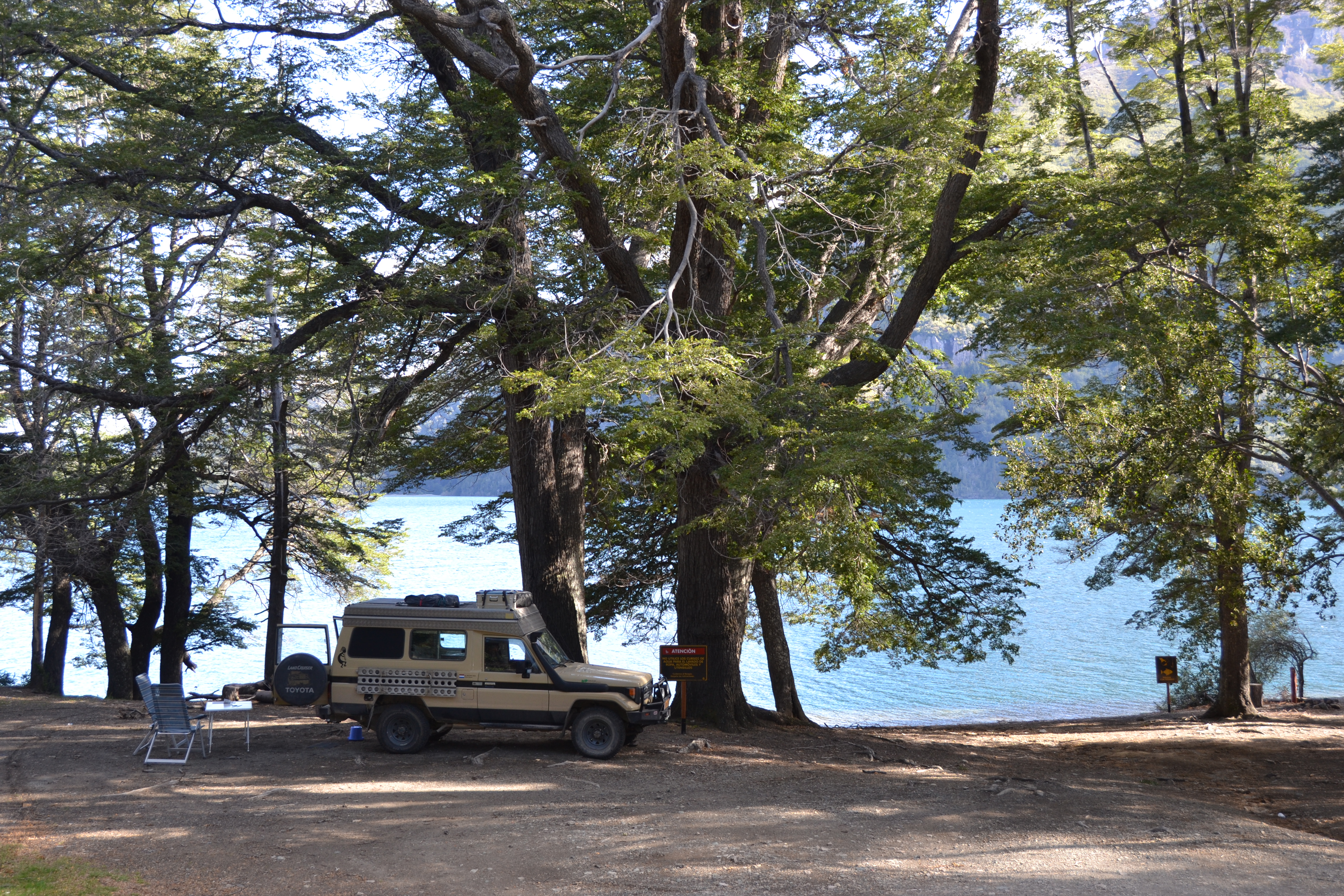 de pieken. De zon schijnt en de bergen zijn weer zichtbaar. Bij El Bolson is de vallei echt groen en de bomen een stuk verder dan in de omgeving; echt postcard pretty zou de Lonely Planet zeggen. We passeren het dorpje Cholila, waar Butch Cassidy en the Sundance Kid geprobeerd hebben een eerlijk bestaan op te bouwen. Helaas werden ze valselijk beschuldigd van een beroving en alsnog achtervolgd (en gedood in Bolivia). We gaan Parque Nacional Los Alerces binnen en stoppen bij de eerste de beste plek om te picknicken -> filmpje YouTube. Het is fris maar uit de wind prima uit te houden. Bij de parkwacht laten we ons voorlichten over de activiteiten en mogelijkheden in het park. De boodschap is nogal simpel: alle campings zijn gesloten (behalve die zonder faciliteiten) en de Alerce bomen ( een soort sequoia’s) kunnen we alleen zien met een excursie en die is vandaag al geweest en pas overmorgen weer. Hm. Er is nog wel een wandeling waar we er één kunnen zien. Nou ja, de omgeving is ook mooi, dus we rijden verder en genieten van het landschap en het weer. Uiteindelijk vinden we op een verlaten wildcamping (Playa Francés) een mooi plekje achter een paar dikke bomen. Joost slaat gelijk aan het sprokkelen van hout en zagen van boomstammen, want een vuur hebben we hier wel nodig. Gelukkig heb ik een echte man die weet wat een vrouw nodig heeft: warmte!