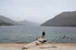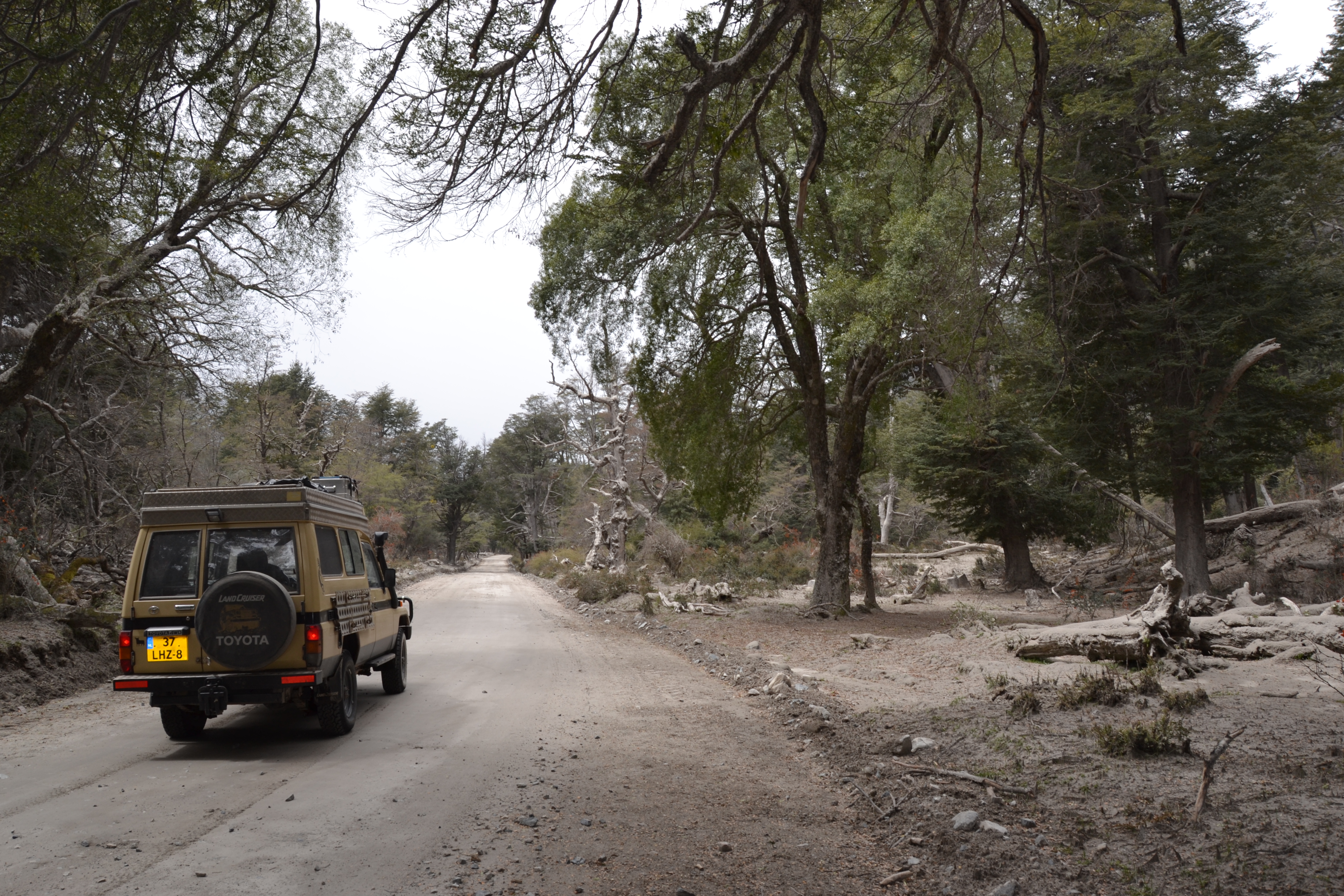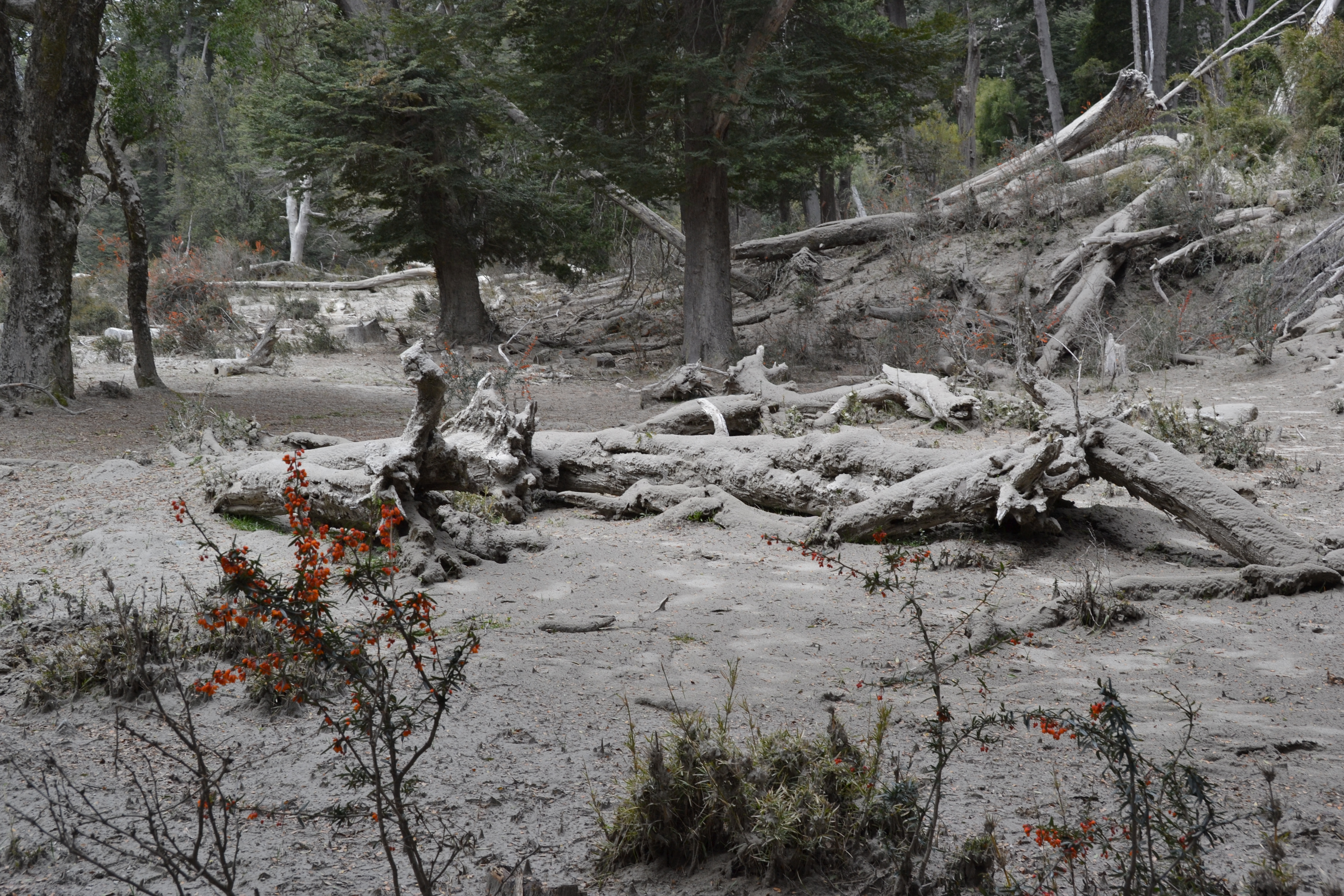 Maandag 17 oktober gaan we op pad om de Ruta de Siete Lagos te rijden (de route van de 7 meren). Dit is een beroemd stukje weg door het Argentijnse merengebied. Het weer is er niet ideaal voor; het is bewolkt en guur. Maar goed, de bekers gevuld met Nescafé en een lekker zoet broodje van de plaatselijke panadería, dan gaat het zeker goed komen. Na Lago Hermoso wordt het landschap ineens wat wittig, net of er overal zand ligt. Verderop wordt het nog opvallender. Bij Lago Traful picknicken we aan het meer en daarna ziet het bos eruit alsof er grijze sneeuw ligt. Mijn hersencellen werken tijdens de reis niet zo snel meer, maar ineens schiet het me te binnen. We kijken naar het resultaat van een vulkaanuitbarsting in buurland Chili! Dat is hier vlak bij en de aswolk is hier neergedaald. Als we bij het plaatsje Villa Traful aankomen, ziet het er echt verschrikkelijk uit. Het schoolplein en het dak van de school liggen nog vol met as, de strandjes liggen vol en er liggen hopen as langs de weg. De lucht zit vol met stof. Wat een ramp. Als we in Villa de Angostura aankomen, ziet het er echt uit als een wintersportplaatsje: houten huizen en