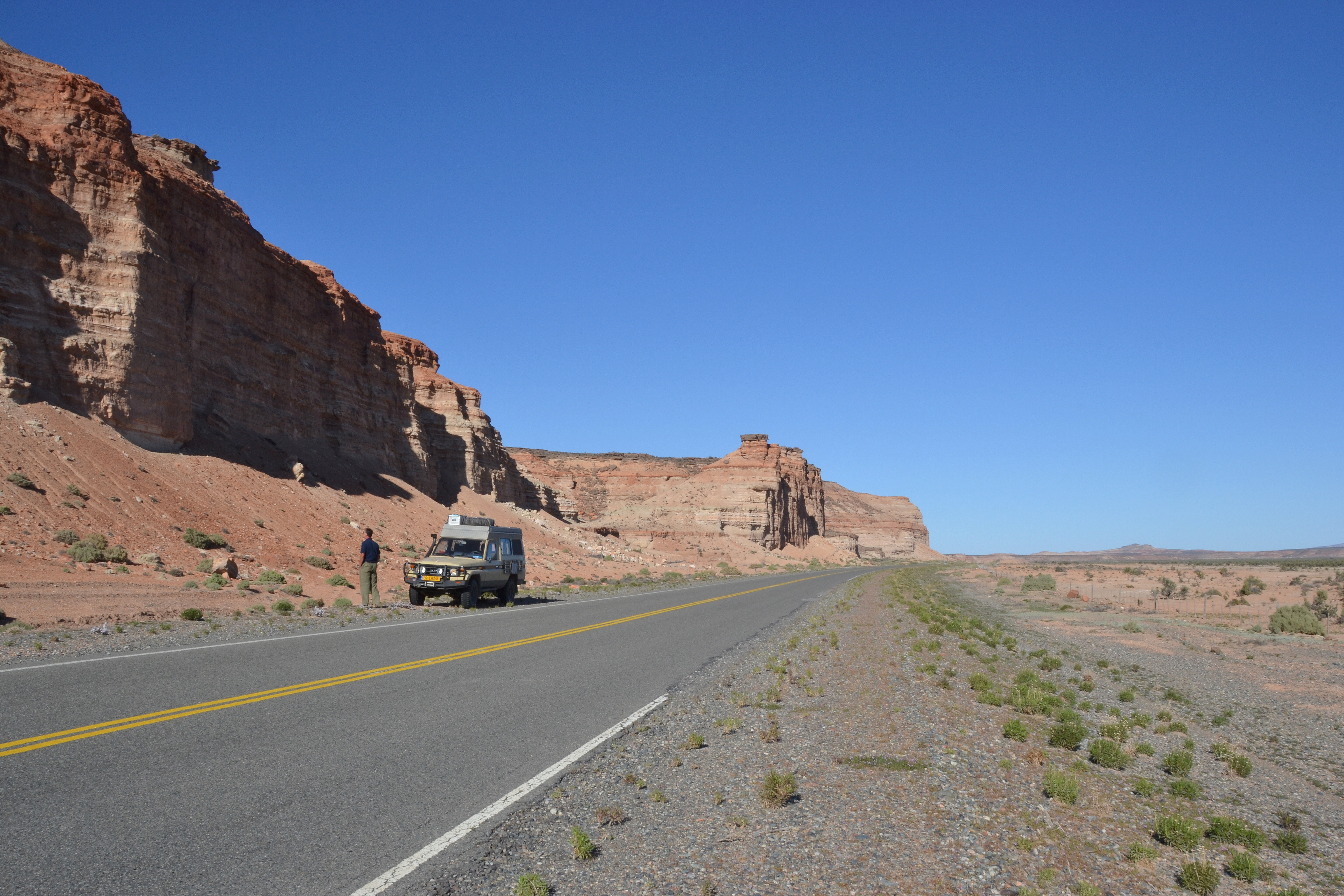 Als we de volgende dag 22/10 doorrijden, wordt het landschap ineens interessanter. Hier stroomt de Rio Chubut (zo heet ook de provincie) en die laat sporen in het mesa-achtige landschap na: groene valleien en rotswanden.