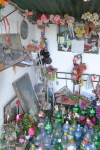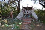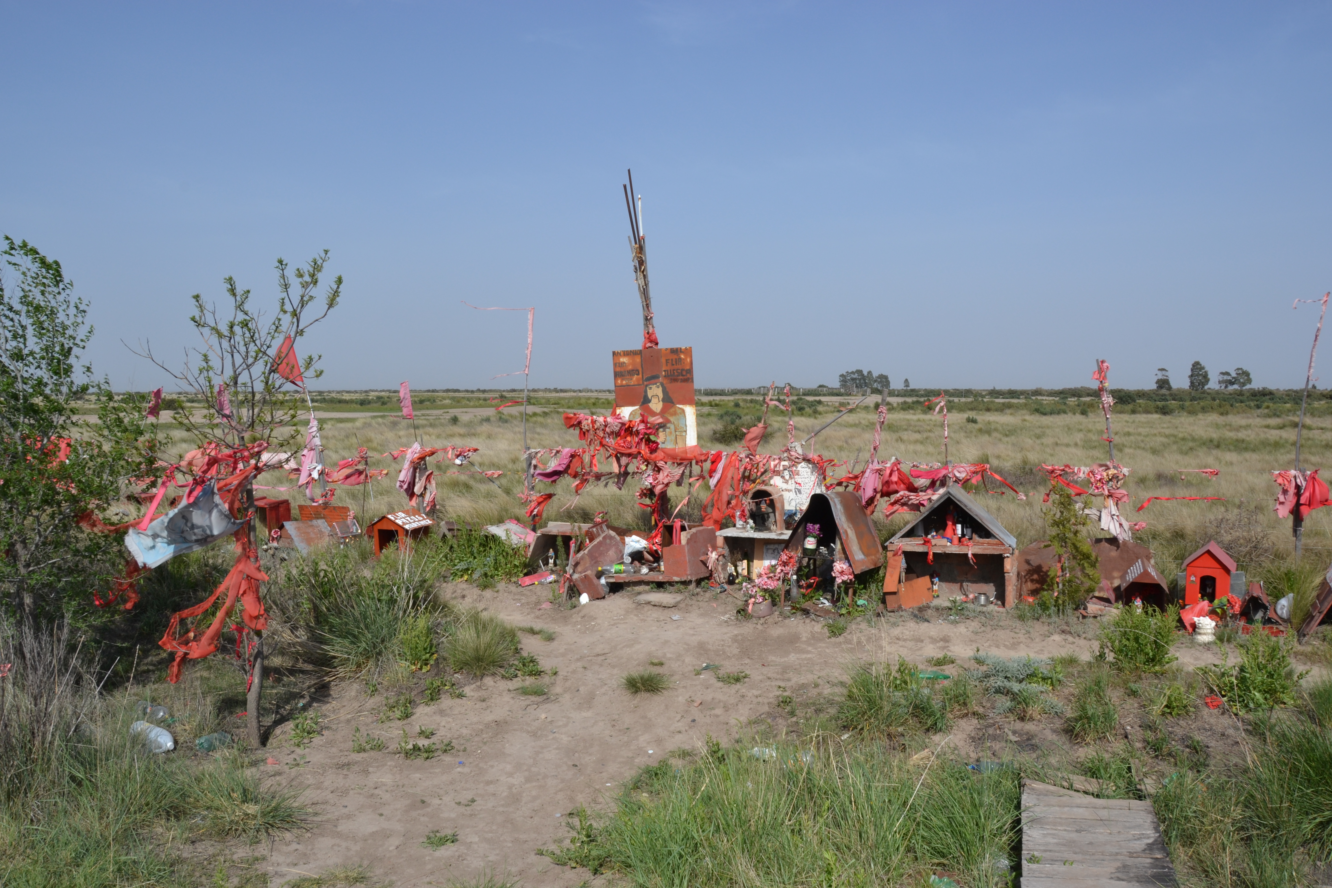 mensen met beperkte tijd echt aanraden om het land rond te gaan met een vliegtuig. We worden wat melig van de vlakten met bosjes. De tumble-weed die af en toe over de weg rolt, draagt wel bij aan het effect van de troosteloze weg. Opmerkelijk genoeg komen we 3 keer fietsers tegen, hoe bedenk je het?! Bij één stel stoppen we even of ze hulp nodig hebben, het meisje is net gevallen. Argentijnse wegen hebben over het algemeen geen vluchtstrook en als er dus een vrachtwagen achterop komt, dan heb je waarschijnlijk de neiging het gravel naast de weg in de schieten…Om te tijd te doden maken we lijstjes met hoogtepunten van deze reis, mooiste kampeerplekken, lekkerste eten, tips voor anderen en een wensenlijstje voor een volgende auto. In de auto lees ik snel wat over Viedma, maar kom tot de ontdekking dat daar aan de kust een klein plaatsje ligt met de grootste papegaaienkolonie ter wereld. Dat is misschien wel wat om te overnachten en evne te blijven. Vlak na Viedma neem ik even de gelegenheid om 2 van de duizenden altaartjes te fotograferen die langs de Argentijnse wegen staan. Grofweg zijn er 2 typen verering: 1) voor La difunta Correa, een vrouwelijke heilige (http://en.wikipedia.org/wiki/Difunta_Correa) en 2) voor Gaucho Gil, een soort Argentijnse Robin Hood (http://en.wikipedia.org/wiki/Gaucho_Gil), hiervan zijn de altaren altijd rood gekleurd. Bij beide typen altaren liggen heel veel volle flessen water bij om de dorst van de heiligen te lessen. Geen idee waarom juist automobilisten en truckchauffeurs juist deze heiligen vereren. Ze geven wel kleur aan de wegen!