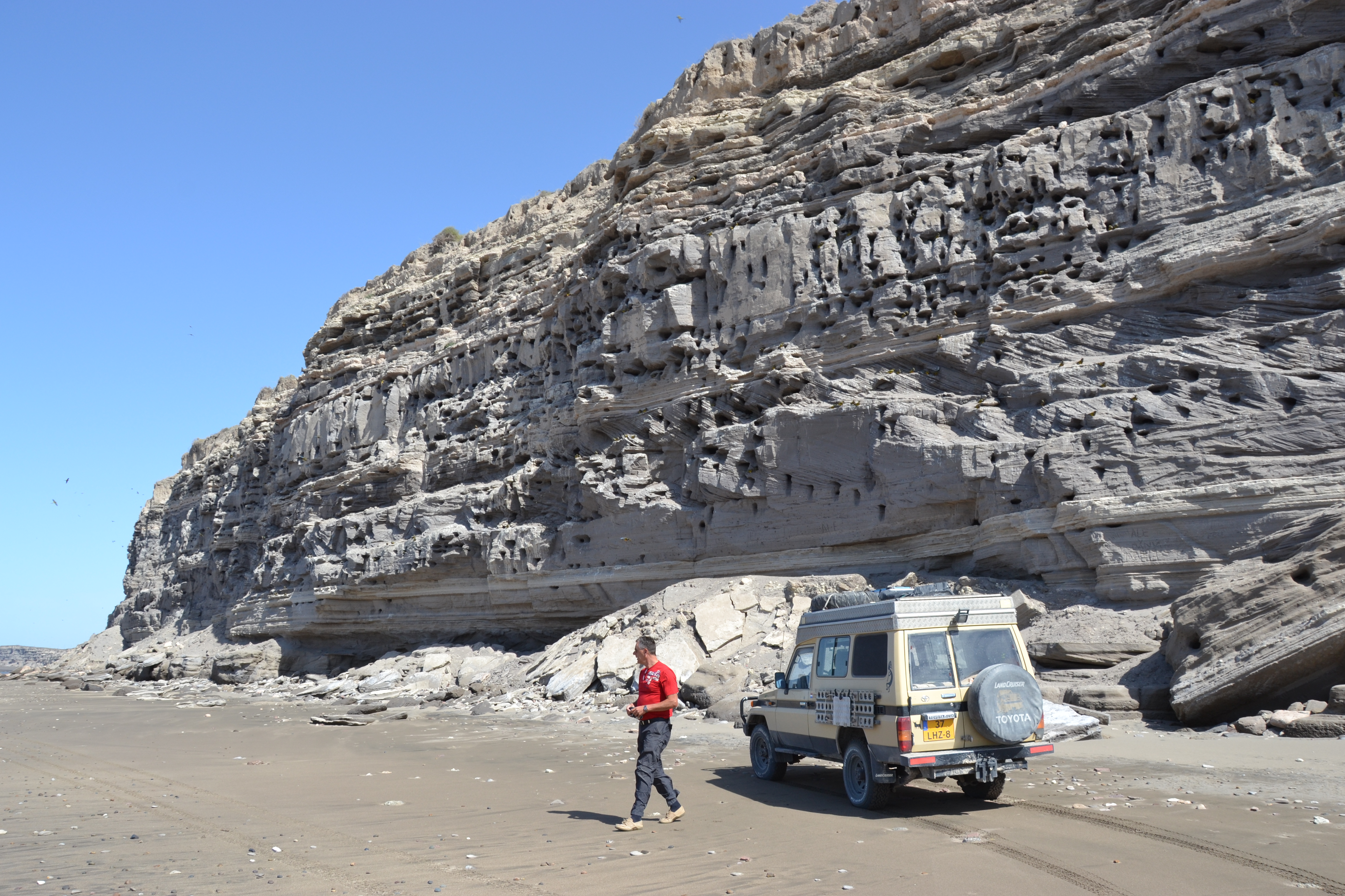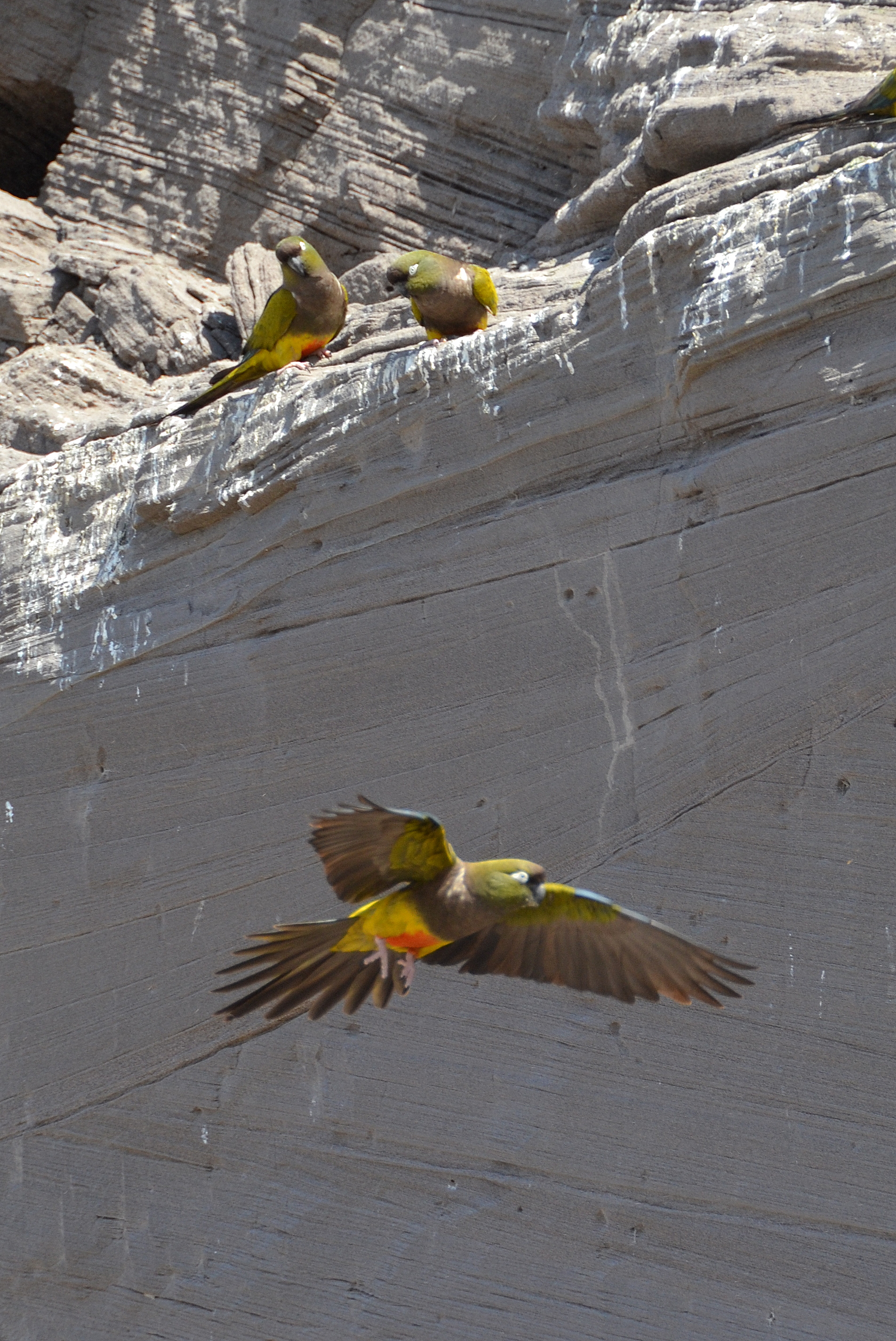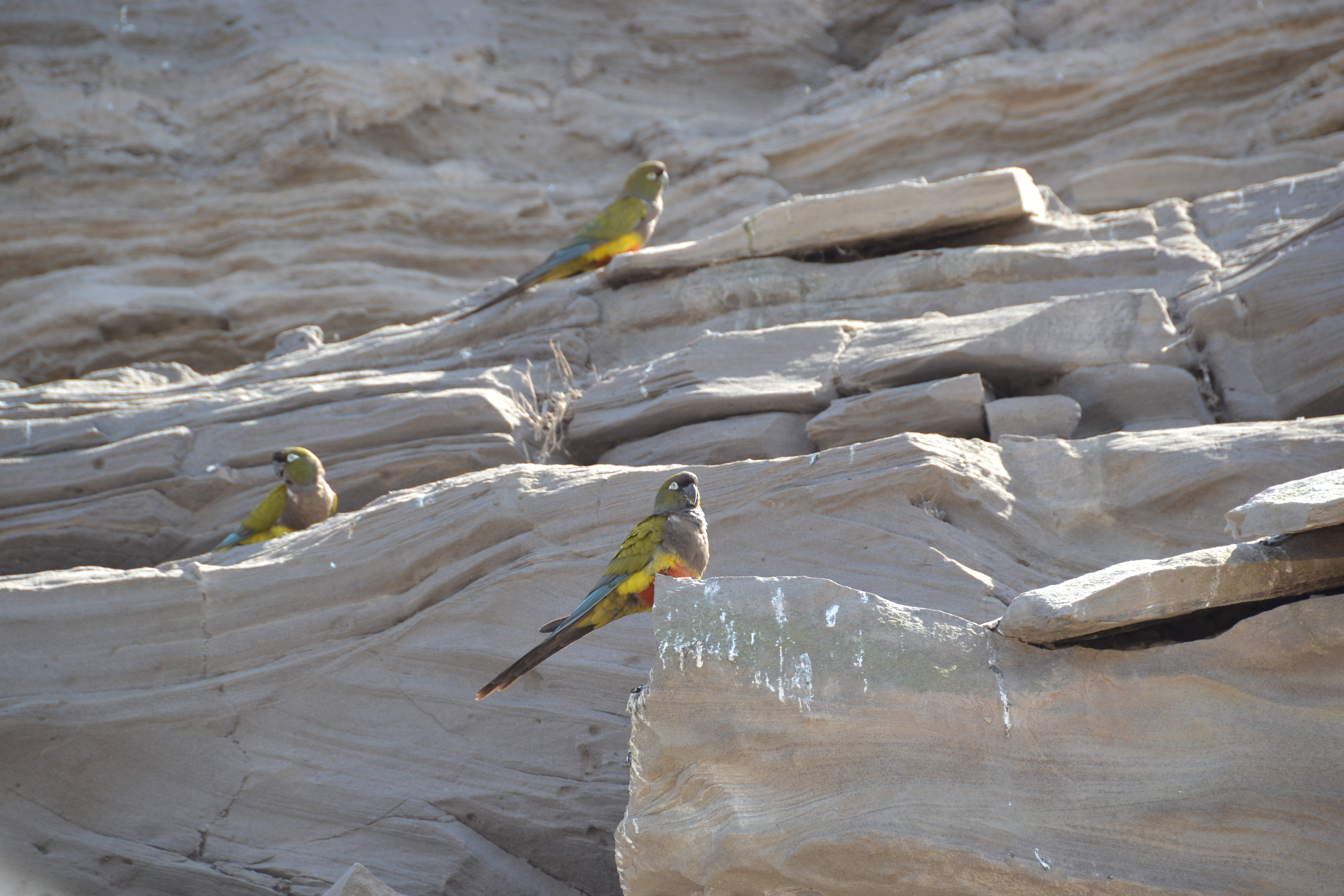 De volgende ochtend worden we vroeg wakker omdat bij het opkomen van de zon de papegaaien weer flink tekeer gaan. Niet onaangenaam overigens; het is leven in de brouwerij! Na een eenvoudig ontbijtje halen we bij de plaatselijke supermarkt een tarjeta voor de plaatselijke WIFI. Heel innovatief: deze badplaats heeft overal WIFI en als je aanlogt, zie je dat je een kaartje bij de plaatselijke autoservicio moet kopen voor 2, 4 of 6 uur Internetten. Geinige oplossing. Dan gaan we op weg naar de papegaaien. Aan het einde van het dorp beginnen steile rotskliffen. Over een lengte van 12 kilometer hebben zich hier 35.000 paren gevestigd. Ze maken diepe nesten in de zand- en kalksteen. We kunnen met de auto het strand op en er vlak naast parkeren. Het is overweldigend: helemaal alleen met duizenden papegaaien. Als we uitstappen en dichterbij komen, worden ze helemaal wild. Een enorme kakofonie stijgt op vanaf de rotsen. Geweldig -> Filmpje YouTube. Met een beker koffie in de hand genieten we van dit onverwachte natuurgeweld. Als we even later bovenlangs langs de kustenweg rijden zien we ze in groepen vliegen langs de rotsen.