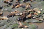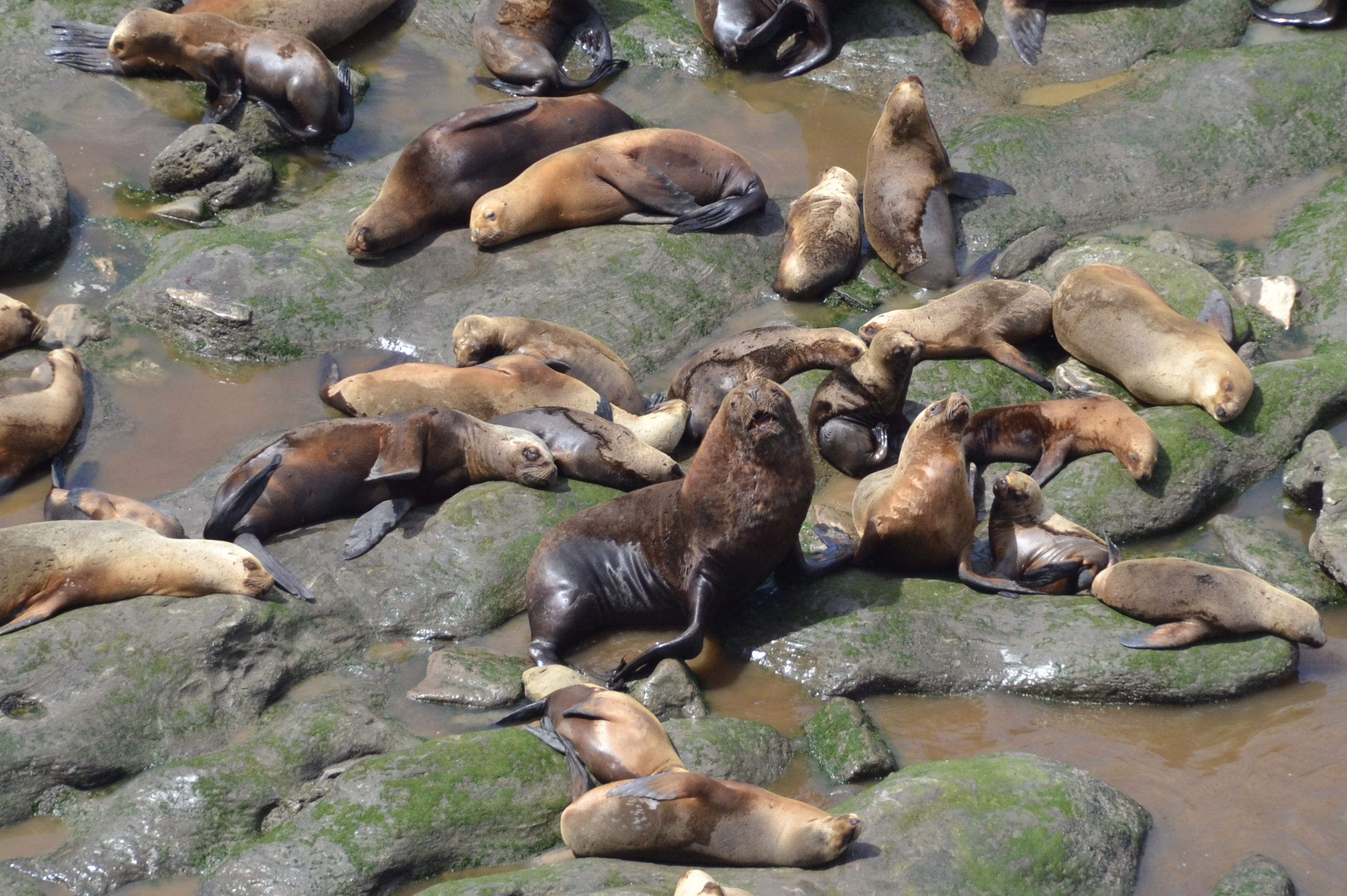 langs de kust boven het strand zijn gebouwd. Joost roept al snel: “Oh, hier liggen er best veel”. Ik loop iets verder naar links en roep terug: “Jeetje, dan moet je hier eens kijken!” We kijken met stomme verbazing over een langgerekt stuk strand werkelijk vol met zeeleeuwen. De attente parkwachter staat vlak achter ons en dus stel ik de voor de hand liggende vraag: “¿Quanto lobos viven acquí?” En met een achteloos gezicht zegt hij: “Siete mil” Hoeveel?? Ja, dit is een van de grootste kolonies in de w