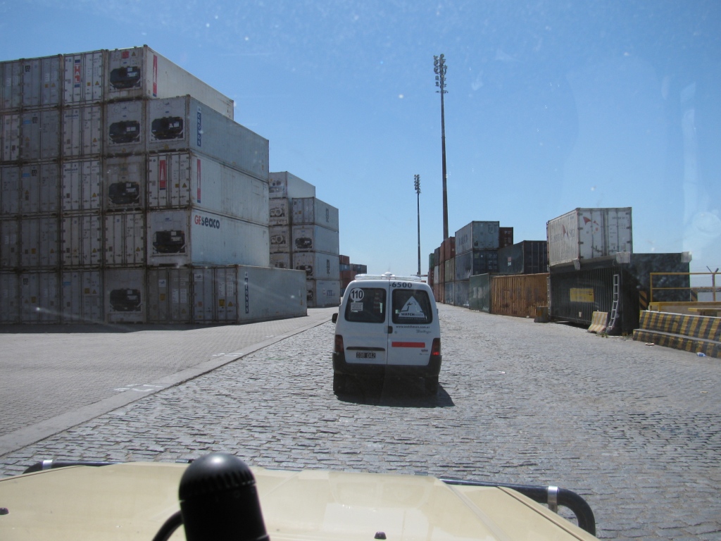 Donderdag blijkt dat we de auto naar de haven kunnen brengen. We spreken af met Francisco Weber in de haven. We mogen zelf door de douane rijden. De douane beambte komt vrolijk half uit zijn raampje hangen en roept of we Argentinië leuk vonden. Heel aardig. Vervolgens rijden we achter Francisco over het haventerrein naar de scanner. Dat is een heel aparte ervaring. Sinds een half jaar moet iedere container hier doorheen. Het is een vrachtwagen met een soort arm ernaast waar je je auto voorrijdt. Er is niemand te zien, maar Francisco gebaart dat we ervoor moeten gaan staan en uitstappen. Na 5 minuten gaat ineens een sirene en gaan de zwaailichten aan. De arm beweegt langzaam langs onze auto. Even later wordt er omgeroepen dat alles in orde is. We hebben nog steeds niemand gezien, heel onwerkelijk. We rijden verder naar een openstaande container. Joost maakt de accu’s los en de auto wordt zorgvuldig vastgesjord (beter dan in Antwerpen). Francisco verzegelt de container en klaar is kees. Fluitje van een cent. We worden keurig met een bus over het haventerrein naar de uitgang gereden; “speciaal voor toeristen” grapt Francisco. Indrukwekkend om dat eens even te zien. De Grande Brasilia van Grimaldi ligt er ook; enorm. We eten wat in San Telmo en lopen nog wat rond.