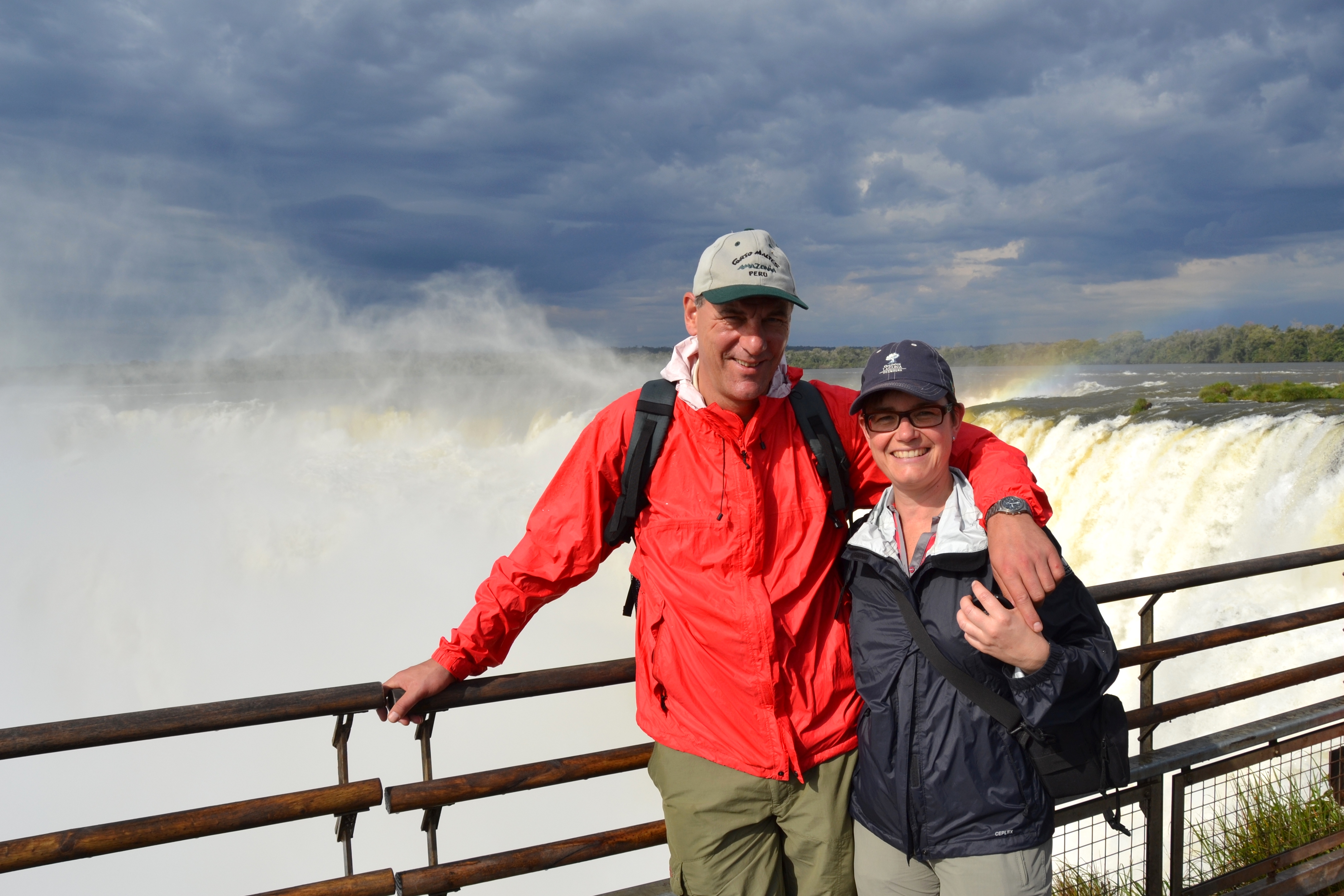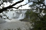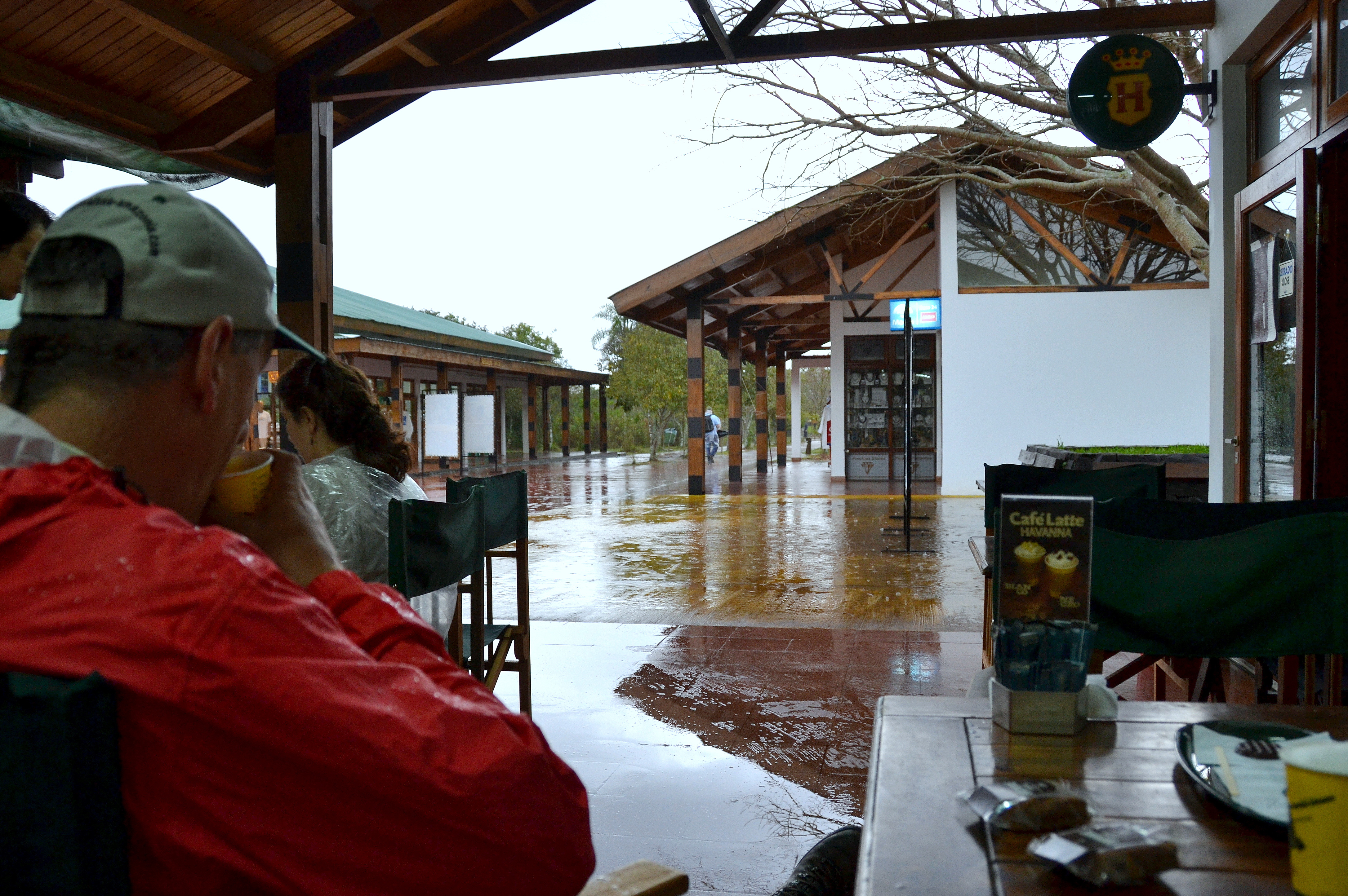 De volgende ochtend staan we vroeg op, want het natuurwonder wacht: de Iguazú-watervallen, de grootste ter wereld. Als we opstaan komt het met bakken uit de hemel, maar we gaan er voor. We leveren een bult was in bij de receptie, want dat is hier vanavond al klaar. Bij het Iguazú park aangekomen betalen we toegang (voor buitenlanders 100AR$ pp en auto 24AR$). De prijzen zijn wederom verdubbeld met wat er in de Lonely Planet van 2010 staat! Dit is op andere plekken ook het geval. We parkeren pal naast het complex want we zijn om half negen zowat de eersten met de auto. Bussen staan er al wel en daar worden hordes mensen uitgeladen getooid met plastic regencapes en op slippertjes. Wij trekken de bergschoenen en regenjacks maar aan. Als we de ingang voorbij zij