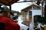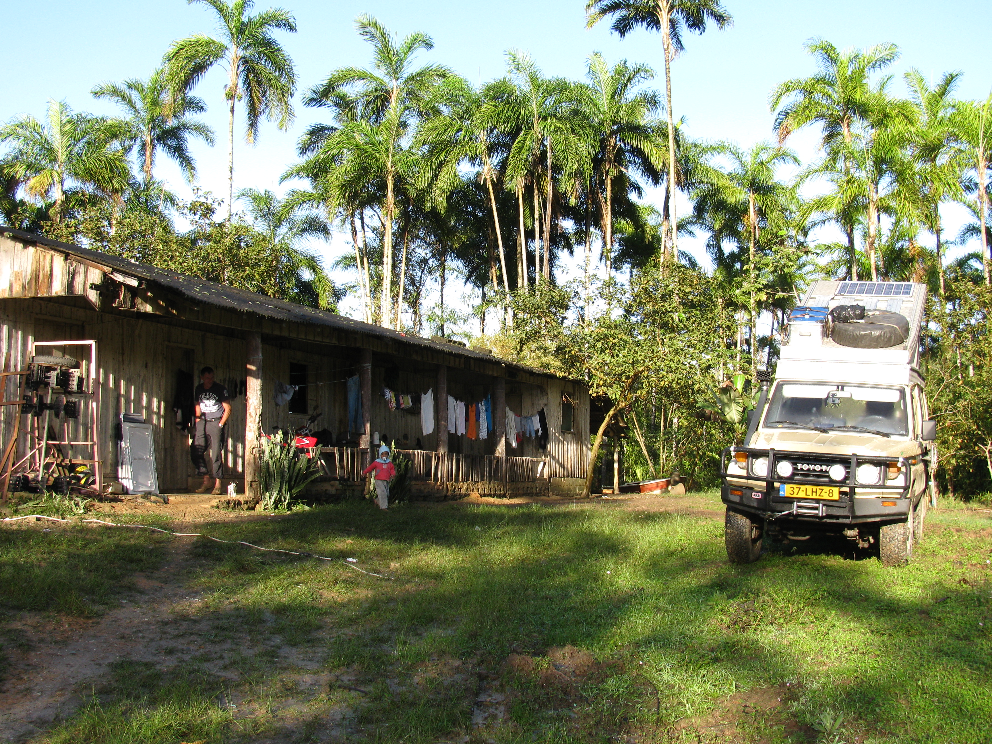 We zijn op weg naar Cananéia, aan de kust. Als we er bijna zijn is een deel van de weg flink ondergelopen en halverwege zit ook nog een bruggetje. Oeps, nadat we meegemaakt hebben wat water in de wiellager kan doen, heb ik daar niet zoveel zin in. We proberen nog een ander weggetje maar ook dat eindigt met water. Dan moeten we hier toch maar naar een plekje zoeken, want het is al 17 uur. Joost rijdt op de gok een hoger gelegen weggetje in en , ja hoor, dat eindigt op iemands modderige erf. Tja, omdraaien gaat niet zo makkelijk hier en hij komt ons al