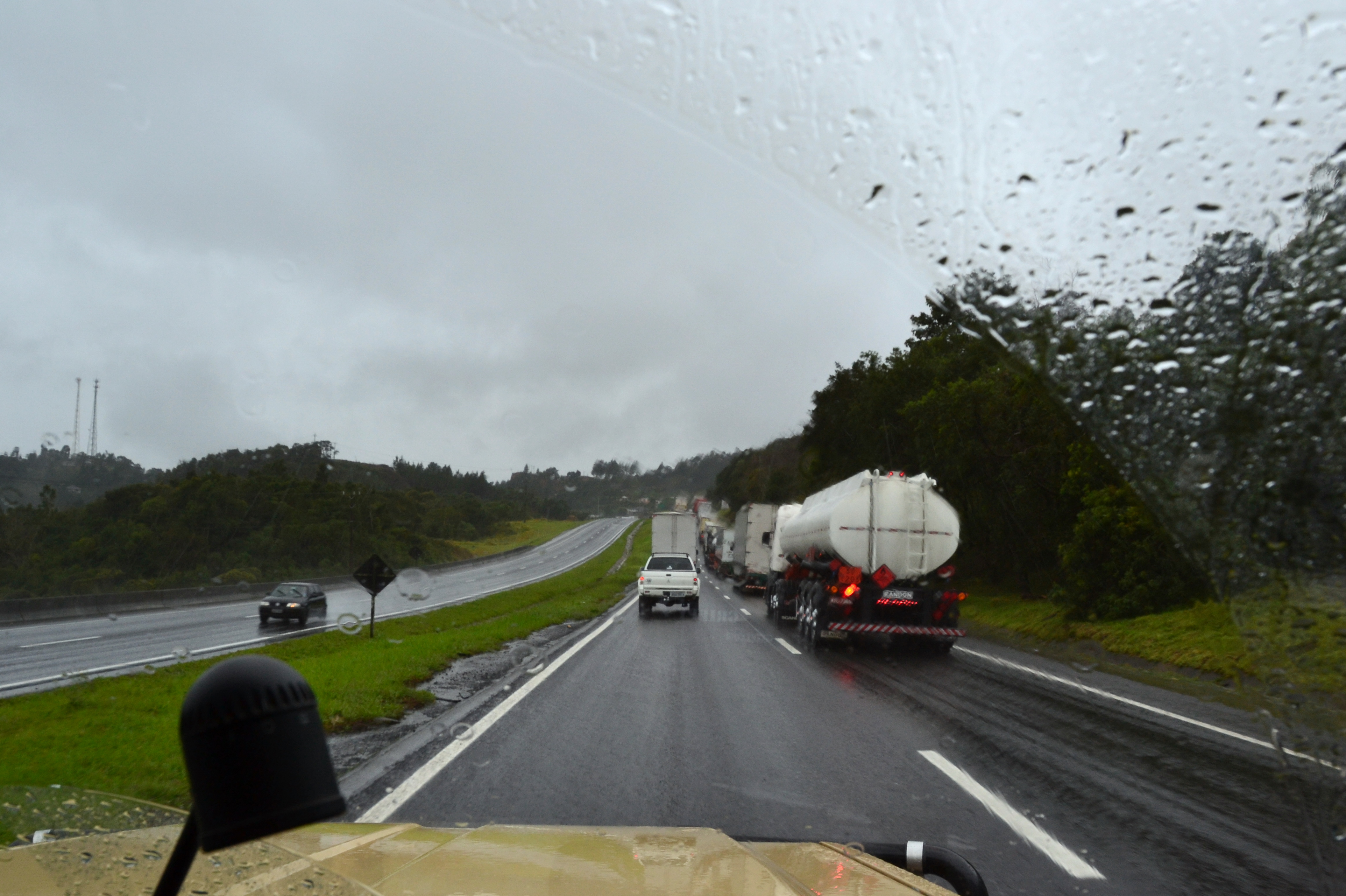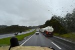 De volgende dag is het wederom vreselijk weer en de voorspellingen voor vandaag zijn niet goed. We gaan proberen om naar de kust te komen. Over de snelweg via Curitiba moet dat toch lukken. Helaas komen we bedrogen uit. Het is nu maandag en geen idee waarom, maar de snelweg rijdt barstensvol met vrachtwagens, die met een bloedgang hun weg zoeken (linker en rechterbaan) op af en toe hele slechte wegen (dit is de weg (116) van Curitiba naar Sao Paulo!). Er zijn opvallend weinig personenwagens. Om de haverklap staan we in de