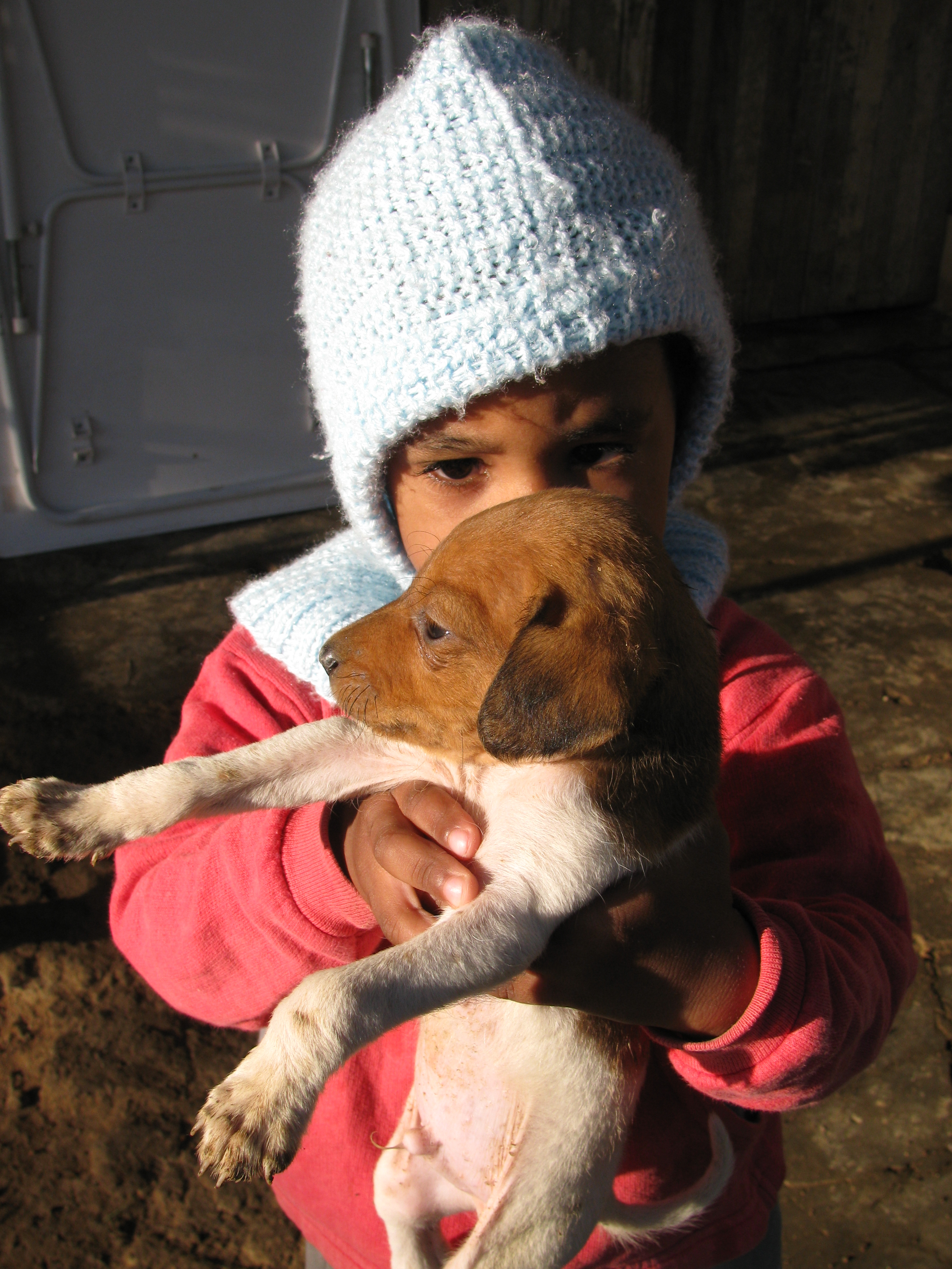 tegemoet. Dan maar vragen of we hier mogen staan. Je moet je voorstellen: dit is een eenvoudig houten huis en er omheen wemelt het van de dieren. In de modder wroeten 3 varkens, honden en kippen. Ik probeer in een beetje Portugees te vertellen dat we