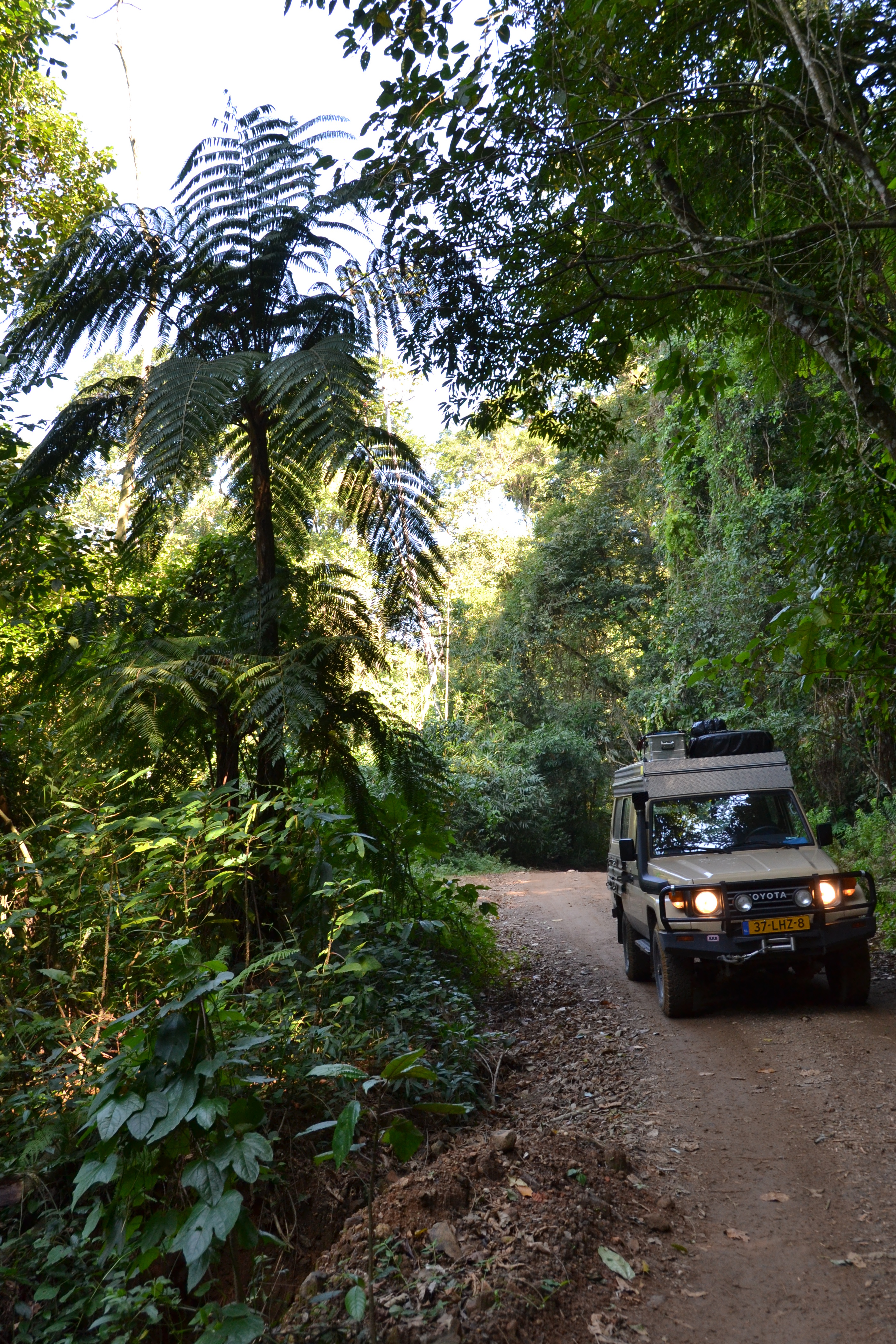 anders uit. We rijden een uur door her regenwoud over een ruige weg met flinke hellingspercentages, kuilen, diepe moddersporen en water. Halverwege komen we inderdaad een dappere dodo met een huurautootje tegen (zijn vrouw loopt voorop). Joost vermaakt zich uitstekend en we bereiken met veel motorgeweld Praia de Castelhanos. Dit is een heel lang strand met tropisch bomen erlangs en bergen met regenwoud op de achtergrond. We parkeren de auto langs het strand onder een boom en staan even bewonderend naar het strand te kijken. Voor we het in de gaten hebben zijn we flink gebeten door borrachudos. Dit zijn vliegjes ter grootte van fruitvliegjes die een gaatje in je huid boren en een bloeddruppeltje achterlaten. Tot zover het goede nieuws. Een dag laten wordt dat een rode vlek en gaat VERSCHRIKKELIJK jeuken. Marijke reageert zelf allergisch en krijgt een soort grote zuigzoenen eromheen en twee hele dikke enkels. Joost slaapt er maar moeilijk van.