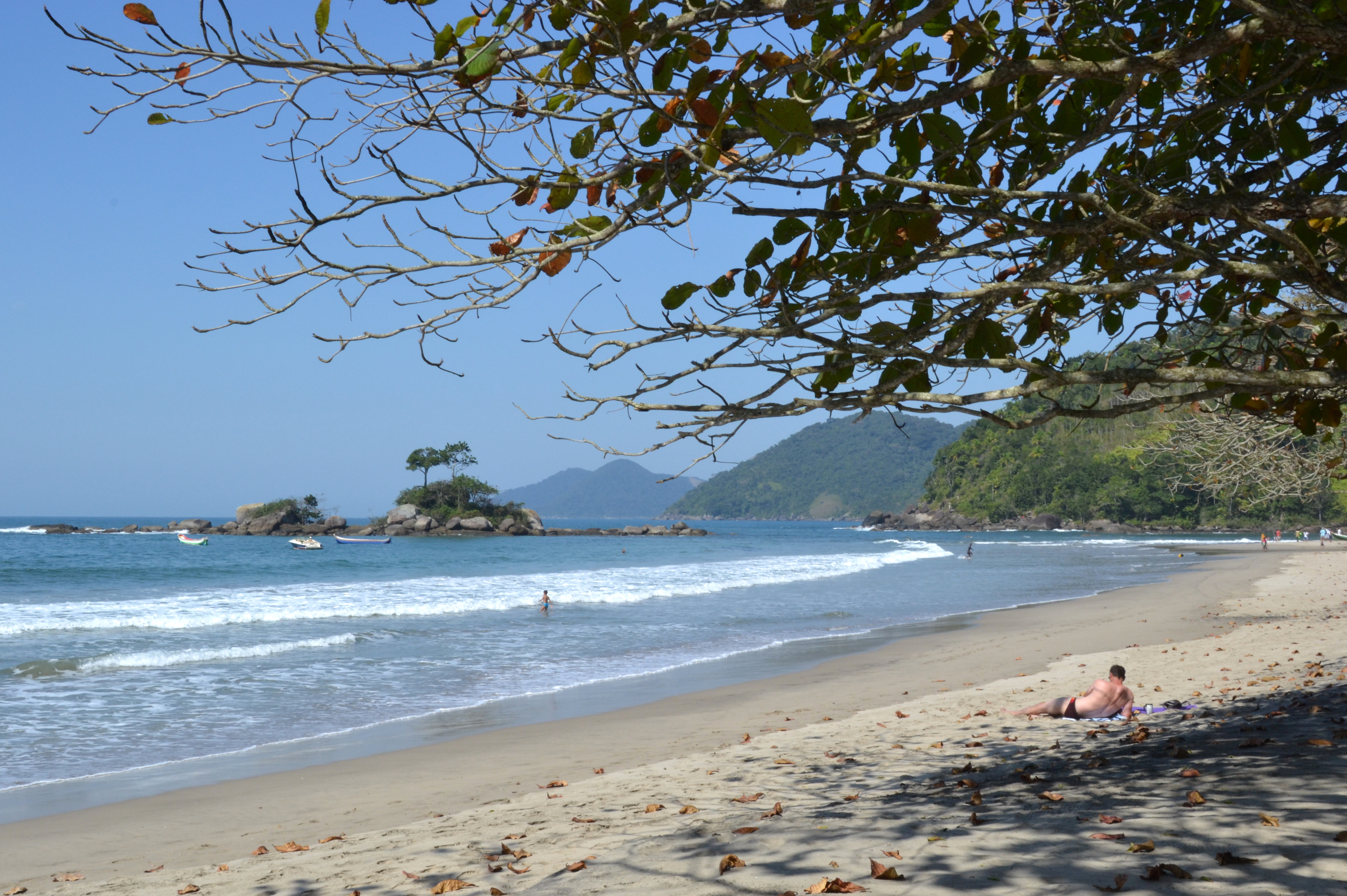 Goed, wij strijken dus op dit prachtige strand neer in badkleding met matching paars badlaken, blauwe nagellak en grote zonnebril èn smeren ons dus he-le-maal in met…….. 40% DEET. Gelukkig helpt dat wel. Helaas zien we hier geen dolfijnen, zoals wel bij Cananéia. Ook zijn er weinig andere badgasten om