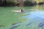 pp (Euro 4,50) in de rivier zwemmen en snorkelen. Als we eraan komen zien we direct de omgebouwde Landrover van de Zwitsers staan die we in Iberá (Arg) hebben ontmoet. Ze hebben hun eigen duikspullen mee en dachten wel even goedkoop te kunnen duiken. Ze zijn verontwaardigd dat het duiken hier 3x zo duur is als in Zwitserland en balen behoorlijk van de prijzen. We kletsen met ze en verkennen het inderdaad erg heldere water. Er zijn heel veel vissen, die helaas worden gevoerd door de badgasten. Met een stokje met maïs eraan tovert een man de vissen uit het water. Ook zien we twee soorten Ara’s (grote papegaaien). ’s Avonds stookt Joost de barbecue op en roosteren we heerlijke Contrafilet. Wat een zalige plek.