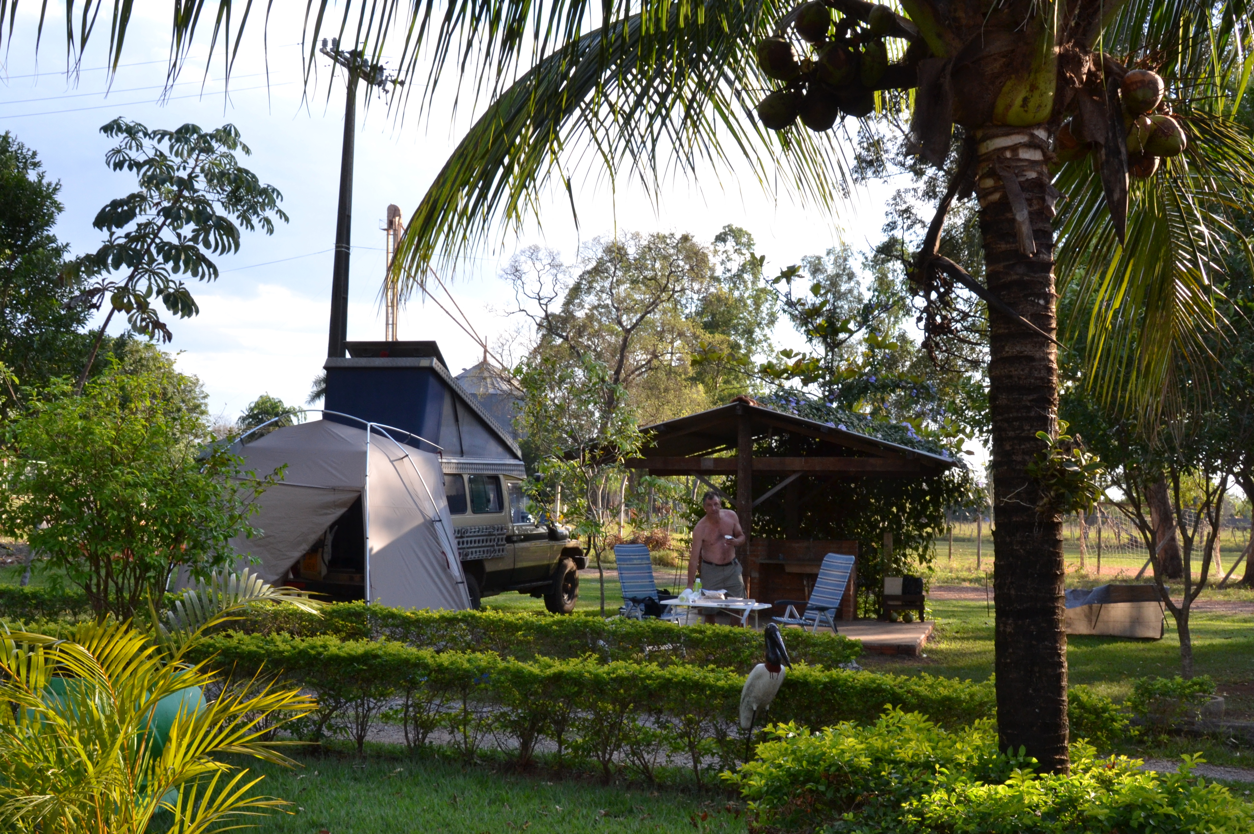 De volgende ochtend worden we gewekt door een megaconcert van kukelende hanen. Joost doucht koud, want de douche staat blijkbaar niet aan. Ze hebben hier echt overal naast toiletten, ook een elektrische douche. Deze hebben een douchekop met een gloeispiraal erin en dus als je het water maar zachtjes genoeg zet, dan heb je een warme douche. We zijn om 8 uur al weer weg, tenminste…. dat denken we (3 dagen later komen we er pas achter dat de staat Mato Grosso een andere tijdzone heeft van een uur eerder). Het landschap lijkt nu meer op savanne: droog met hier en daar een mooi boom of palm. Er staan heel veel witte koeien, vooral de stier ziet er prachtig uit met een hoge bult in de nek en lange lellen onder de kin, heel statig. We zien eindeloze eucalyptus bossen voor de houtwinning en er vliegt een eerste toekan over! Bij de 1e politiecontrole in Brazilië wil de agent alleen maar weten wat er achter in de auto zit. Hij gluurt door een raampje, Joost roept camper, hij steekt zijn duim op en we mogen doorrijden. Onderweg valt op dat de dieselprijzen enorm variëren, soms wel 10 cent zelfs binnen een dorp. Het is dus de moeite even te shoppen. We tanken in Agua Clara alles vol (148 l) bij de plaatselijke witte pomp en krijgen koffie, een autowasbeurt en een fles frisdrank aangeboden. Erg aardig.
