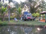 Op maandag 8/8 beginnen we dapper aan de grote oversteek naar het Westen van Brazilië. Bonito ligt op zo’n 1500 km van Ilhabela en gezien onze kruissnelheid is het zeker 3 dagen rijden. We staan dus vroeg bij de veerpont terug naar het vaste land en rijden over prima wegen via het oosten van São Paulo om de stad heen richting het noordwesten. Om de 50 km moeten we een paar Euro tol betalen, maar daar krijg je dan een prachtige weg voor terug. De staat São Paulo is duidelijk in goede doen. Ook de benzinestations zijn hier net een tikje groter en netter dan in de staat Paraná. Het is warm en we doen ’s middags de airco aan (we hebben geen getinte ramen). We zien voor het eerst 30 meter lange vrachtwagens. In het illustere plaatsje Itirapina vinden we dankzij de GPS zowaar camping Paraíso das Aguas). We krijgen een eigen eendeneiland