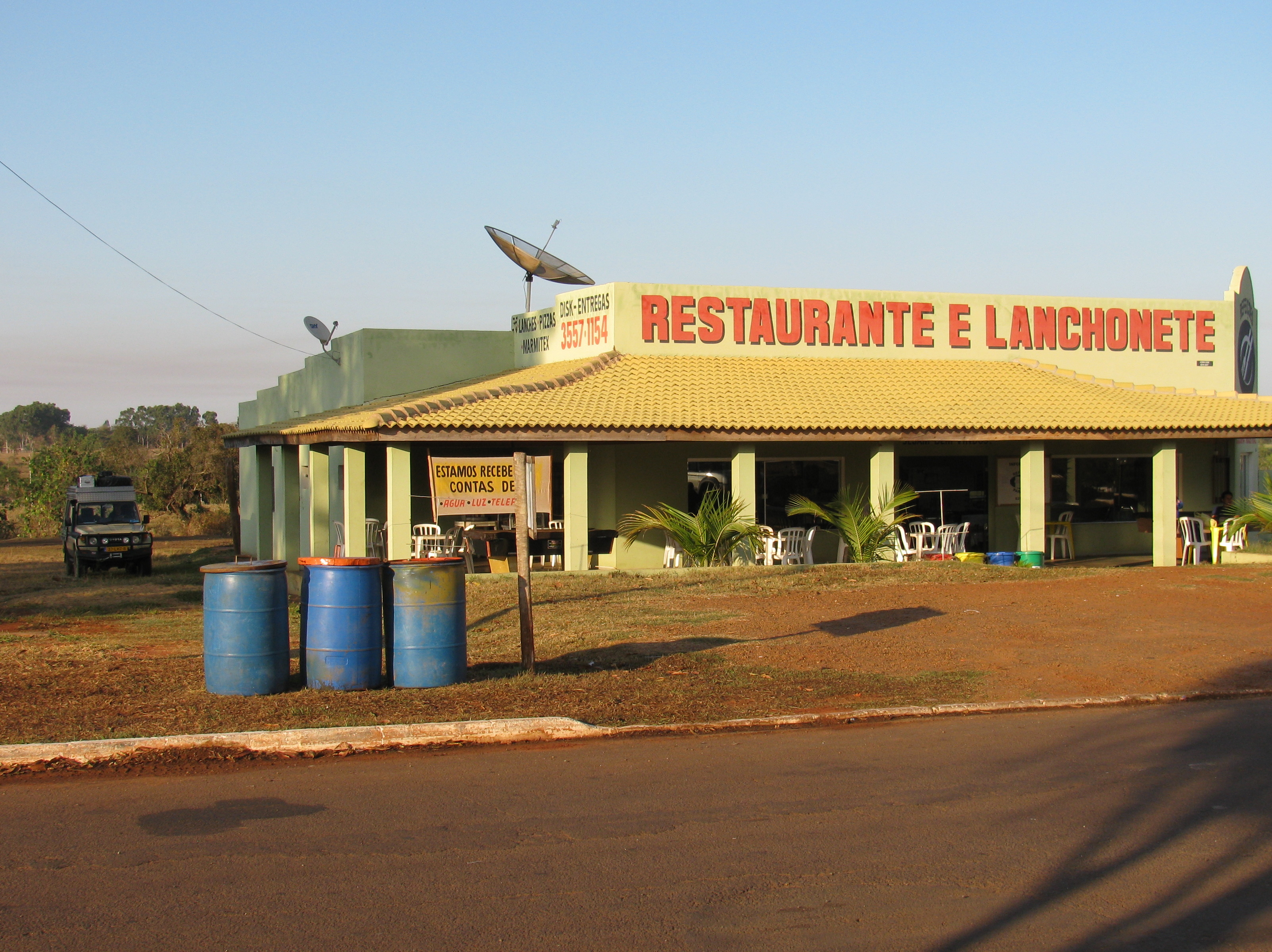 De volgende morgen skypen we even met Jacomien en Jaap en gaan vroeg weer op pad. In de grote stad Bauru willen we wat broodjes kopen. Op zoek naar een supermarkt komen we bij een werkelijk immense Walmart terecht. Je raad het al, dat werd dus meer dan broodjes alleen. Snel wegwezen hier! We rijden nu door eindeloze velden met sinaasappels en suikerriet. Weer veel tol en het is tegen de 30 graden. Om 16 uur komen we aan bij Tres Lagoas. Daar doen we een poging een kampeerplekje te vinden, maar we vinden het maar een vieze stad. Verder rijden maar. Er zijn hier weinig afslagen en benzinestations en dus slaan we af naar het dorpje Arapuã, 4 km van de weg af. Op de snelweg staat een bord van een restaurant waar vrachtwagens een hapje kunnen eten en gratis kunnen staan. Inderdaad zien we een felgekleurde lanchoneta en nemen een biertje. Ik vraag de vrouw o