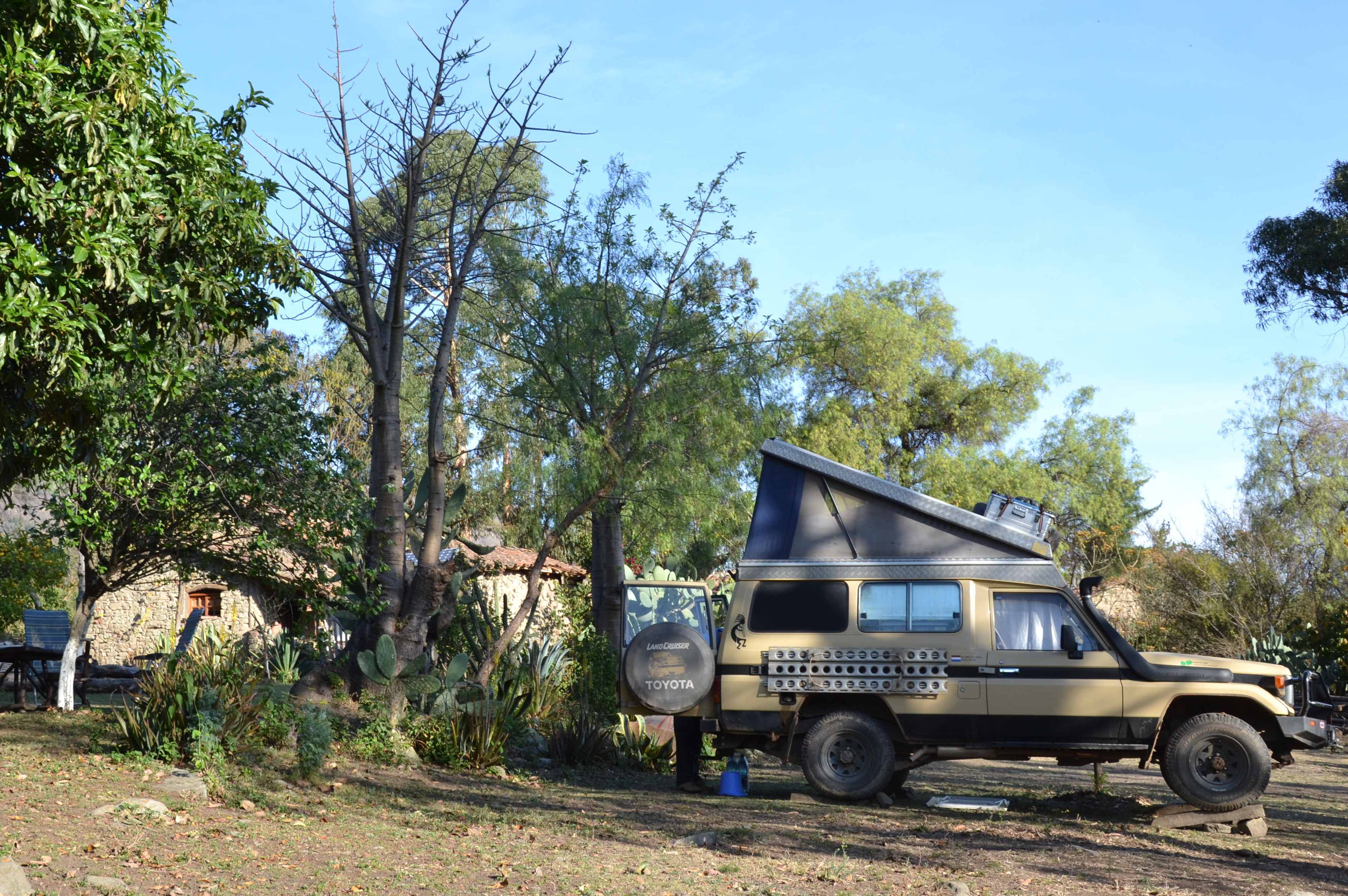 uur komen we bij de brug over de Rio Grande. De rivier is erg smal, maar het uitzicht prachtig. Veel cactussen en een soort kale bomen. Na de brug film ik een stukje weg, dus dat houden jullie te goed (uploaden gaat hier erg lastig). -> Filmpje Youtube. De weg wordt steeds ruiger en wordt flinke steil en smal. De auto heeft het erg zwaar en dan raakt de motor voor het eerst oververhit. Joost zet de auto aan de kant en we horen dat het systeem de koelvloeistof eruit gooit. We wachten een halfuurtje en kunnen weer verder. Helaas gebeurt het oververhitten die dag nog 3 keer en dat geeft geen prettig gevoel. Bovendien is Joost meer met de thermometer op het dashboard bezig dan met het uitzicht. Als we in Villa Serrano aankomen besluiten we niet door te rijden via Camiri naar Tarija (zeker 4 dagen op dit soort wegen), maar westwaarts te gaan naar Sucre. Tegen de avond zijn we vlak voor Zudañez en rijden een zijweg in op zoek naar een plek om te slapen. Ik vraag bij een dakpannenbakker of we in het veld ernaast mogen staan en hij vindt het prima. Hij bakt samen met zijn zoontje met de hand dakpannen en bakstenen op hun erfje. Hij verontschuldigt zich dat we niet op zijn erf kunnen staan. Mensen zijn hier zo aardig. We geven zijn zoontje een pet en een rol koekjes. Hij huppelt weg. We installeren ons op het veldje, eten wat