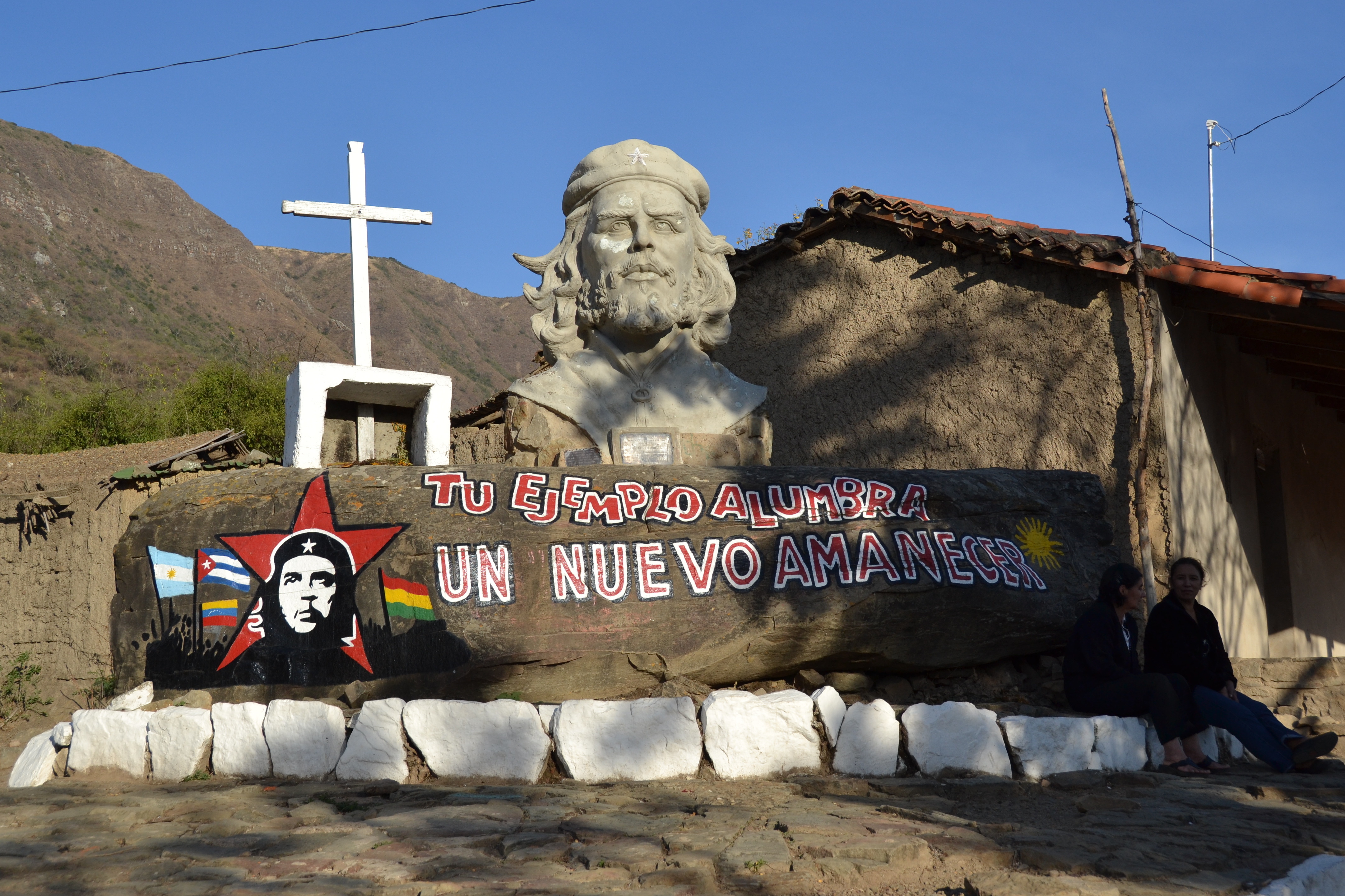 creditcard bij de coöperatieve bank en rijden door een prachtige groen vallei via Mataral naar Vallegrande. De weg is onvoorstelbaar goed met strak asfalt. In Vallegrande rijden we naar de Plaza om toch even te kijken of er een geldautomaat is inmiddels en jawel hoor! Even later toetert Maarten achter ons die ons nog wat tips geeft hoe we naar La Higuera kunnen komen. De weg die we nu rijden heet de Ruta del Che, omdat Che Guevara hier in de nadagen van zijn populariteit is geweest. Het is een lang verhaal, maar uiteindelijk is hij hier terecht gekomen en had het idee de campesinos (plaatselijke boerenbevolking) te verblijden met een revolutie. Dat werkte niet echt en uiteindelijk is hij, zwaar verzwakt, doodgeschoten door het Boliviaanse leger in het plaatsje La Higuera.