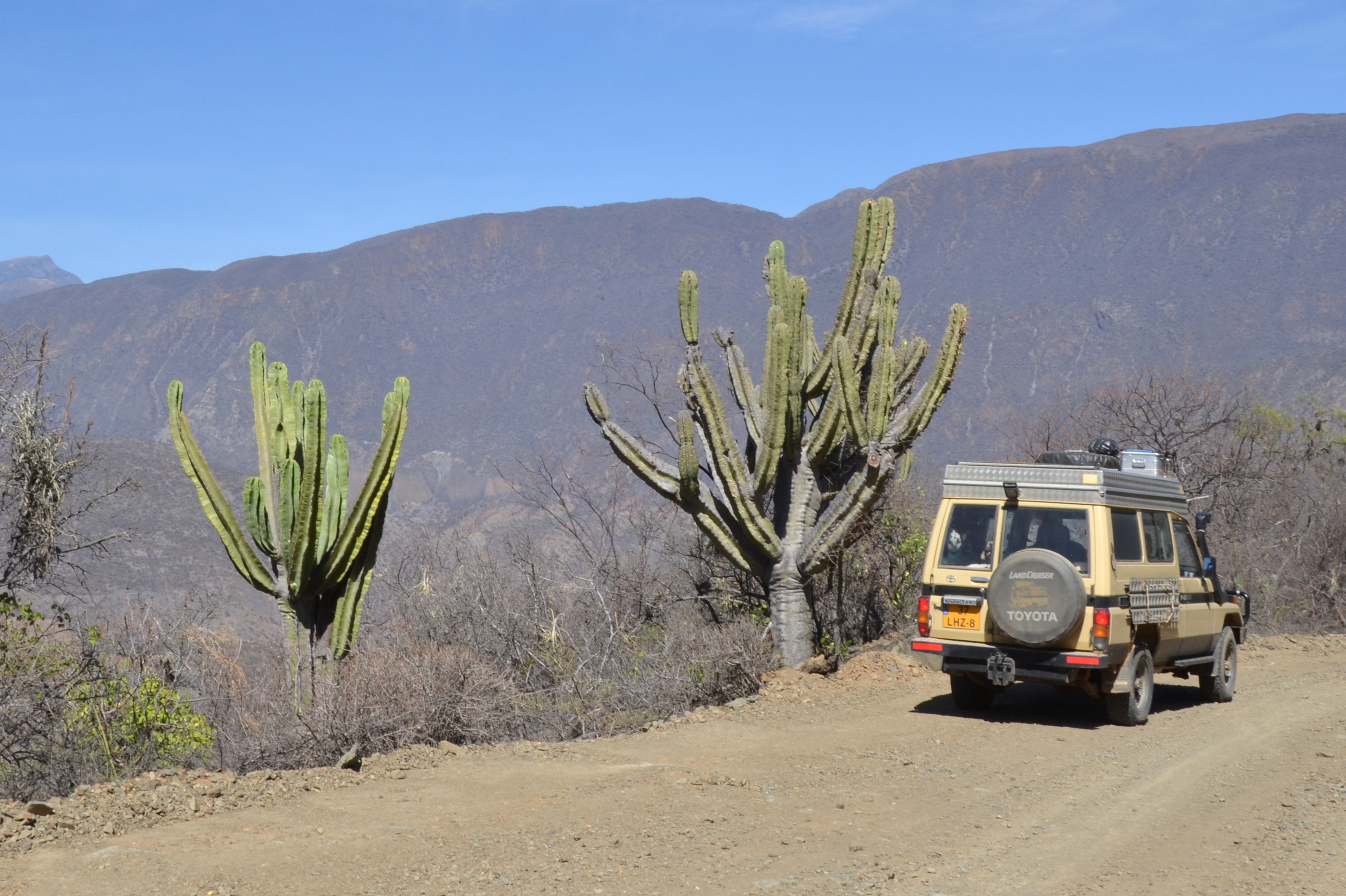 Zondag maken we een rondrit ten noordwesten van Samaipata via Yunga. Het is wel even zoeken, want onze kaart voldoet niet en op de GPS kaart bestaat deze weg niet……..De weg is enorm steil en smal, maar het uitzicht is prachtig. In de bergen willen we naar de reuzevarens. Als we daar aankomen, zegt Doña Leonora dat het nu te laat is voor een rondwandeling omdat die 3 uur duurt. We vertrouwen haar antwoord niet helemaal, maar wat moet je. We rijden verder en genieten enorm van een soort droge Wild West omgeving met reuzecactussen.