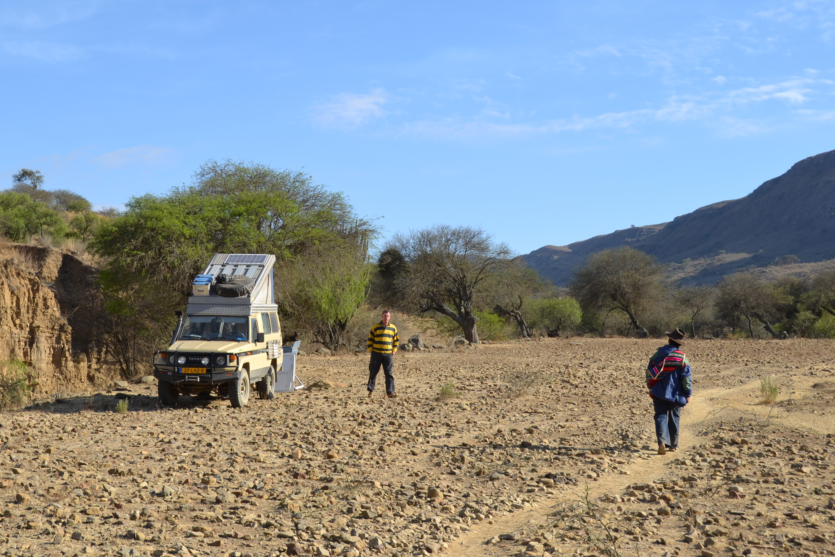 teleurgesteld dat we niet willen kamperen of een wandeling willen maken (=geld verdienen). Als we terugkomen bij de auto blijkt dat zijn amigo met ons mee terug wil. De man is duidelijk teleurgesteld als blijkt dat we nu geen zitplaatsen hebben, omdat we de stoelen en tafel achterin hebben. De uitzichten op de terugweg zijn van een hoog wow-niveau. In de laatste vallei zien we een vreemd geërodeerd landschap rond een droge rivier. ’s Avonds begint het te regenen en wordt het duidelijk kouder. Gelukkig hebben we met slapen nergens last van.