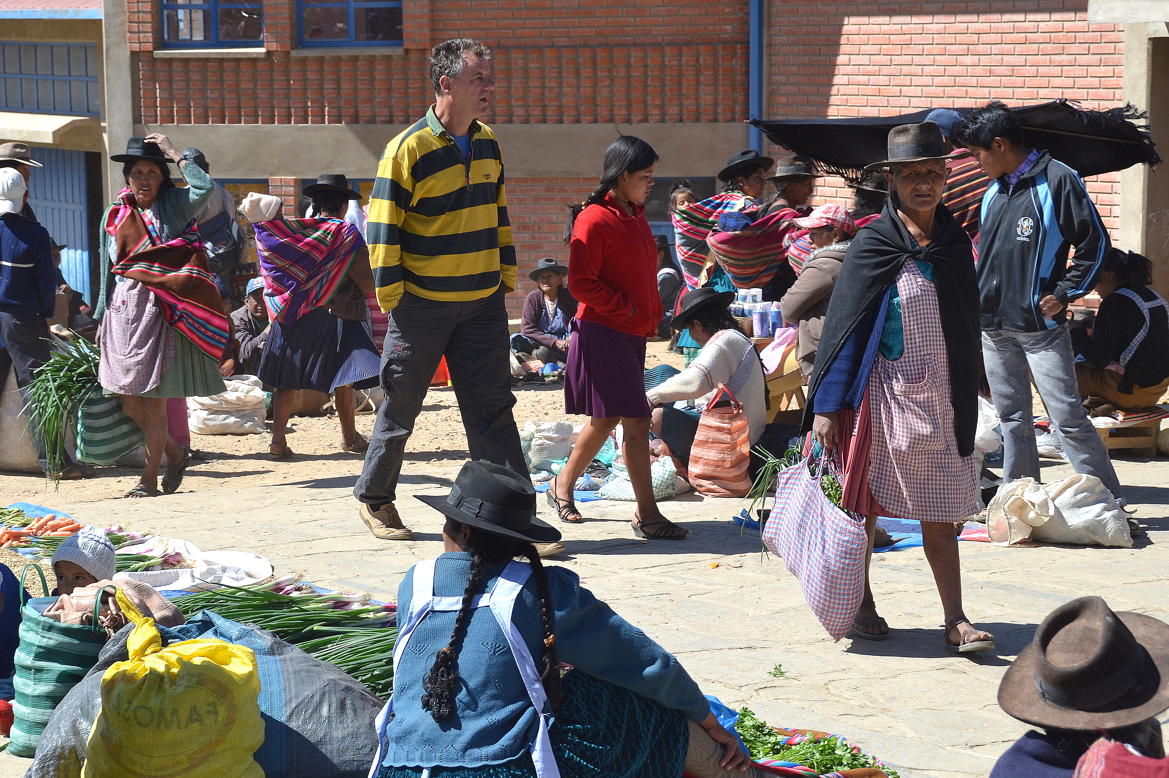 Zondag 11/9 rijden we rustig naar Sucre en stoppen eerst nog even in Tarabuco waar de beroemde zondagsmarkt is. We parkeren de auto in een nauw straatje op nog geen 10 meter van de markt. Een oude baas past op de auto. We lopen rond en het is altijd prachtig om te zien wat er allemaal te koop is. Ik schaf een paar