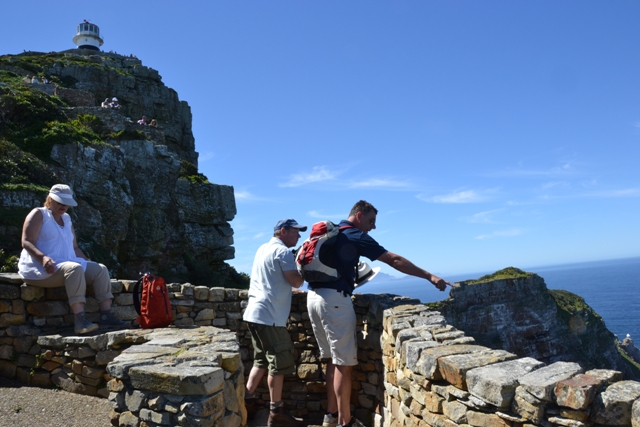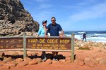 Zaterdag 15 september – Zo, het lijkt wel 25 graden! We ontbijten op de veranda en gaan op pad richting Cape Point. Eerst stoppen we bij Rooikrans om walvissen te spotten. Het duurt even, maar dan zitten er in de verte twee walvissen. Een stuk verder komen we aan bij Cape Point, een van de zuidelijkste puntjes van Afrika. Daar is het nogal druk en toeristis
