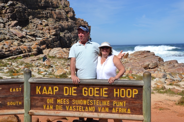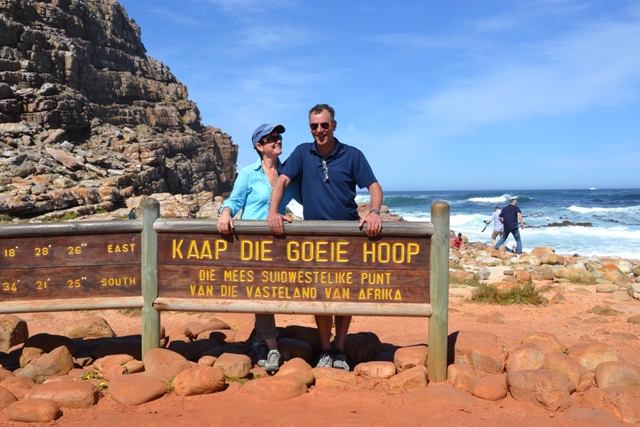an boven hebben we een uniek uitzicht en we genieten er even flink van. Bij Kaap de Goede Hoop eten we onze lunch op de rotsen en poseren even bij het hek. Bij Gifkommetje maken we een leuke (steile) wandeling naar het strand. Effe uitwaaien. Het weer is super en warm. We lopen terug nog even in Simon’s Town rond en eten een ijsje. Daarna op de veranda bij ondergaande zon een lekker wijntje, een potje bollen en daarna een superbraai met een lekker biefstuk en salade. We kaarten heeeel veel.