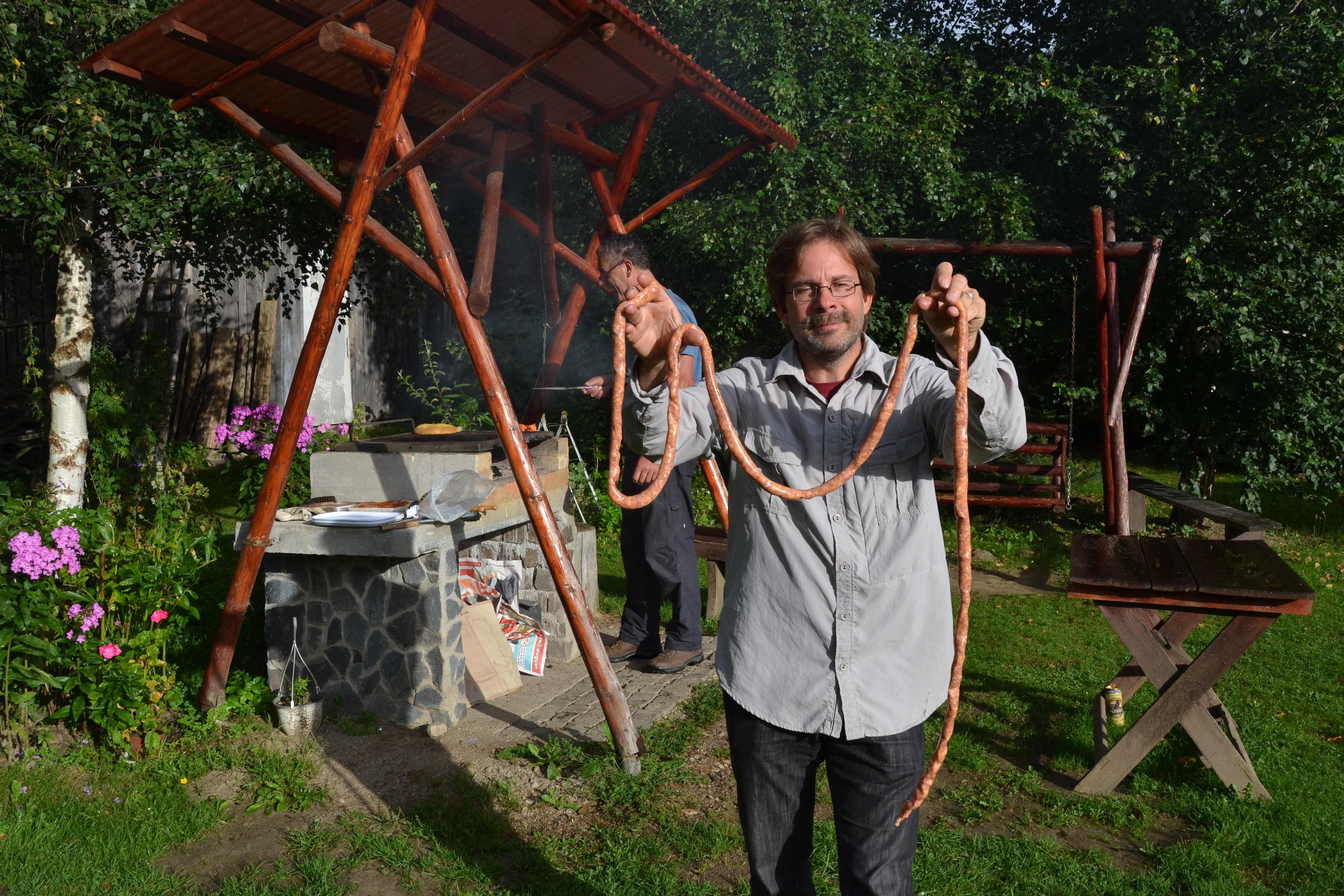 maar ze vertelt snel dat ze Hongaars is. Ze spreekt van meerdere talen een klein beetje en haspelt dat rustig door elkaar om ons te vertellen dat het hier erg koud is voor de tijd van het jaar. De “camping” is eigenlijk het grasveld met vrolijke bloemenperken om haar huis heen. Het huis verhuurt ze evenals een huisje in de tuin. In het andere tuinhuisje woont ze. Zowaar breekt de zon door en kunnen we lekker buiten barbecueën. Harald probeert een enorme worstketting bij me om de nek te leggen. Zo eindigt een regenachtige dag toch nog leuk. ’s Nachts wordt het een graad of 8 en hebben we het erg koud!