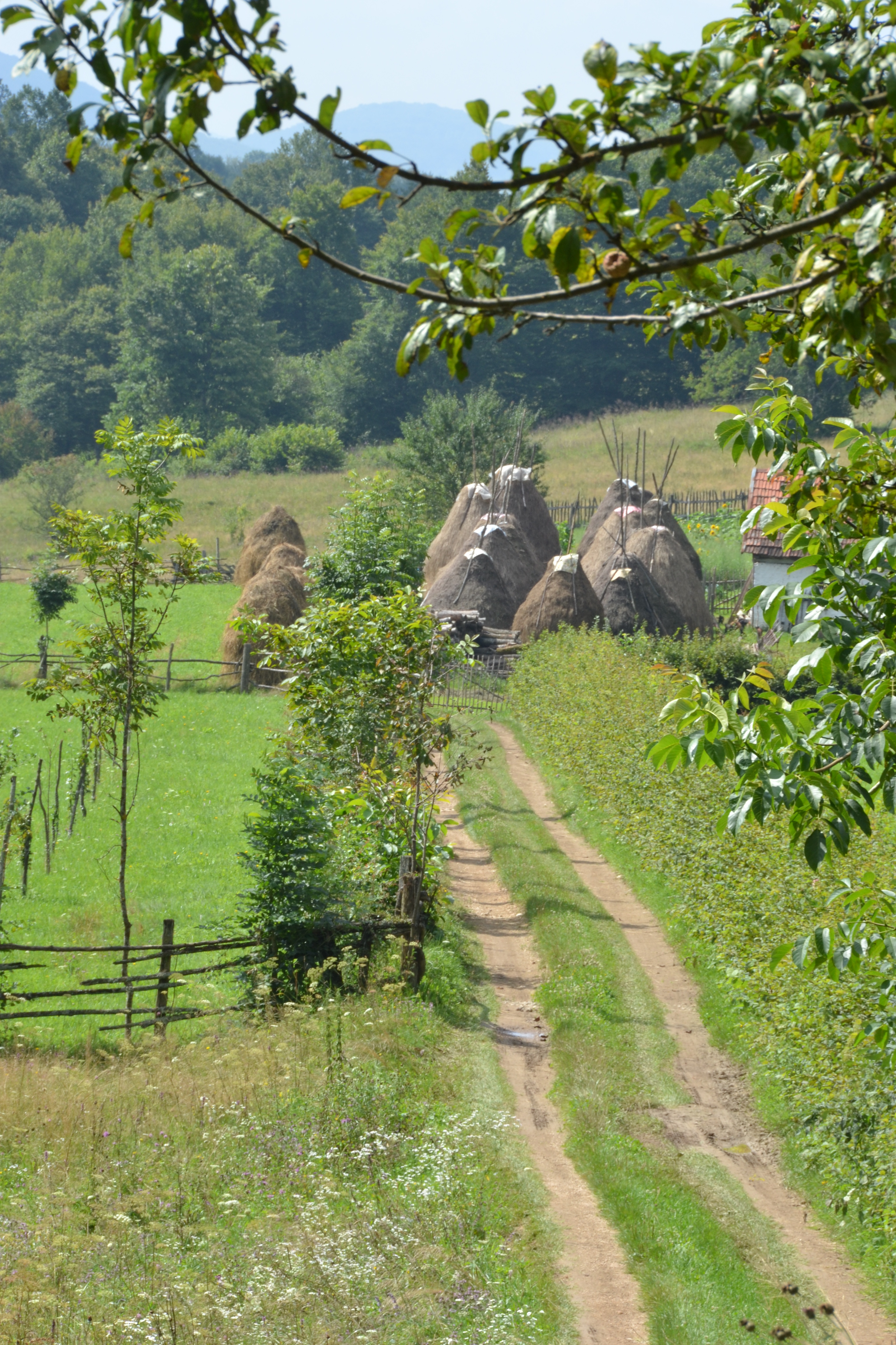 latteland met prachtige met de hand gemaakte hooibalen en simpele boerderijtjes met bloementuintjes en eigen groente. We komen uit bij een grot, waar twee gidsen net een echtpaar de grot uit leiden. Ah, dit is wat die man langs de weg ons probeerde uit te leggen! (hij gebaarde iets ronds, maar Roemeens is niet te verstaan!). We proberen door te rijden maar het pad wordt echt te smal. De weg heeft notabene een nummer, maar er is nauwelijks een doorkomen aan. De heren manoeuvreren de auto’s achteruit om eruit te komen. We lunchen in een weiland voor een verlaten gebouw. Het is 30 graden. Harald, Mariska en Joost besluiten de grot in te gaan.