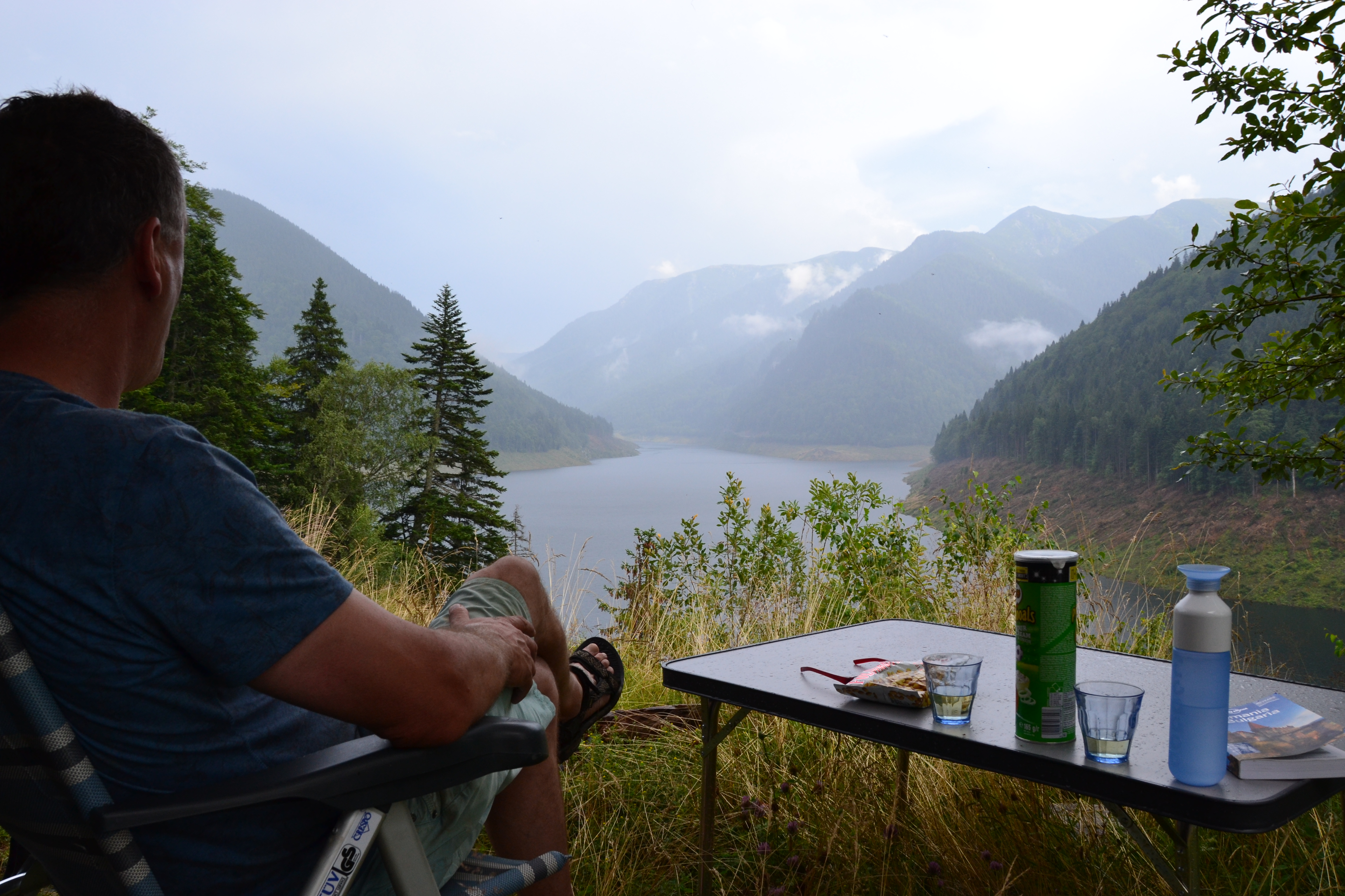 rijden door naar een van de mooiste parken van Roemenie: Retezat. De Toursit Information blijkt gesloten en dus rijden we zelf het gebied in. Het weer slaat om, de temperatuur daalt van 30 naar 23 graden. Veel kamperende dagjesmensen langs de weg. Het meer blijkt een stuwmeer te zijn. We willen eigenlijk wel stoppen en rijden een onverharde weg in en vinden een plekje langs de weg. Er rijden 3 auto’s langs en het regent af en toe, maar ach, we hebben uitzicht op het stuwmeer. Joost probeert de buitenkeuken uit (ons gasfornuis kan op de rijplaten aan de buitenkant) en kookt een lekkere pasta voor ons. Het vuur hoor ik knapperen als ik dit reisverslag schrijf.