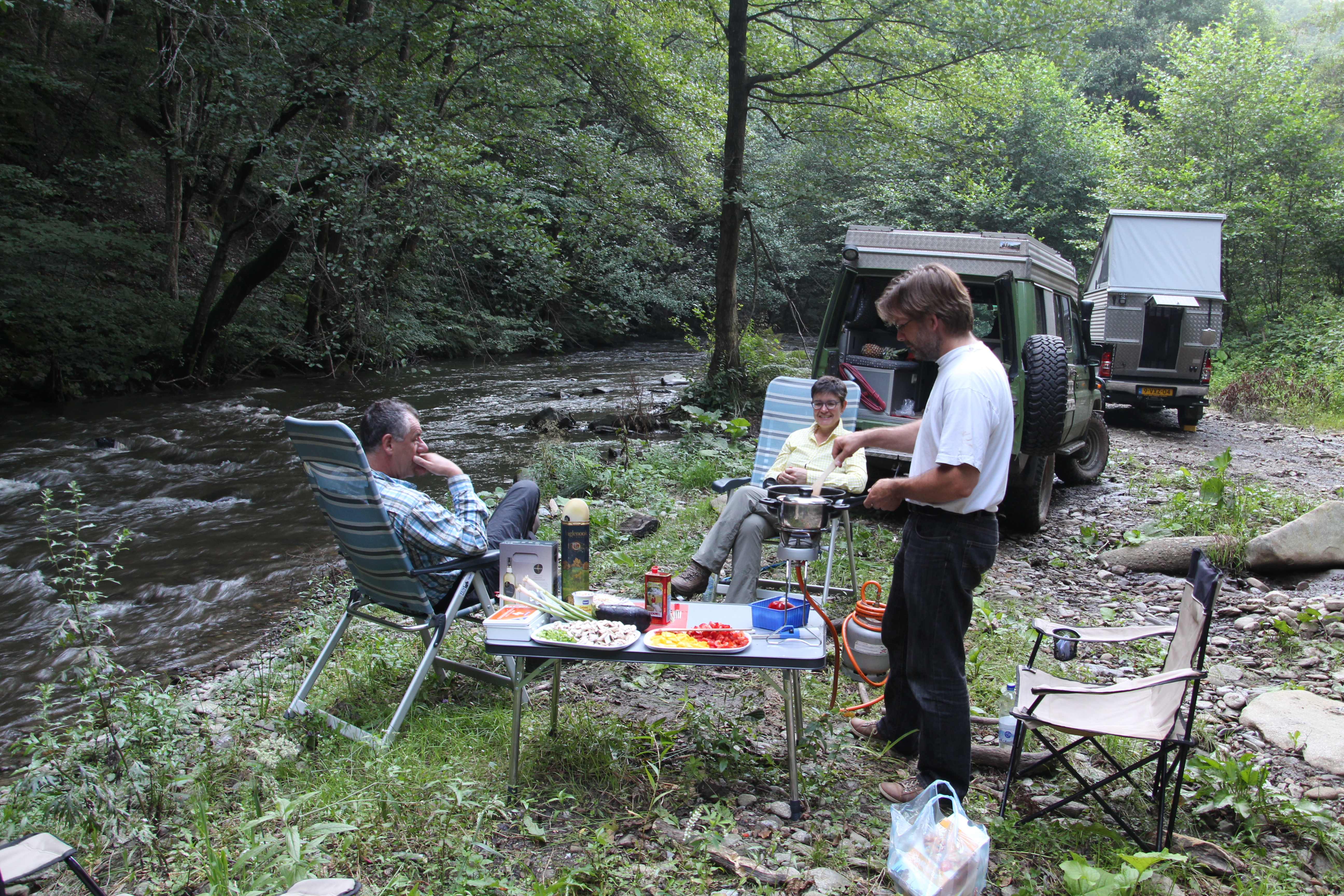 utowasplaats. De mannen manoeuvreren de auto’s op een plek en Harald en Mariska koken een heerlijke kip Madras. We bouwen een lekker vuurtje. Ondanks het enorme geraas van de rivier (Harald meet 80dB) slapen Joost en ik als een os.