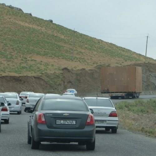 Op woensdag 22/5 rijden we naar de Oezbeekse grens. Die staat niet aangegeven, maar gelukkig heb ik een waypoint. De Kazachse kant is in 20 minuten gepiept. We rijden de brug op in niemandsland en iemand gebaart dat we de vrachtwagens voorbij mogen, maar dat lukt niet. We staan er een uur in de brandende zon. Als we er eindelijk langs kunnen, ben ik als passagier zo door douane heen. Ik zeg ‘Assalom aleikum’ tegen de beambte en krijg een enorme glimlach en een hand terug. Welcome in Uzbekistan! Iedereen is bijzonder aardig. Bij Joost duur het veel langer omdat die de auto moet importeren. Een schimmig proces, maar vooral erg tijdrovend. Bij de veterinary control probeert de man ons 8000 som te laten betalen. Ik zeg in het Russisch dat we nog geen som hebben en waarom moeten we eigenlijk betalen? Hij geeft het op en probeert daarna wel een gesprekje met me aan te knopen. De douanebeambte klimt in de camper unit en wil alle laadjes zien. Vooral bij iets wat op medicijnen lijkt, willen ze weten wat het is. Joost biedt hem een Fishermans friend aan en het is heel duidelijk dat ie die niet lekker vindt! Niet onvriendelijk maar de hele procedure duurt 3 uur. Direct buiten de poort kopen we een verzekering voor 3 dollar en proberen we de bedelaars en geldwisselaars van ons af te schudden. Eindelijk Tashkent in. De grootste stad van Uzbekistan met grootstedelijk rijdgedrag: chaotisch en snel. Joost heeft er geen problemen mee. Geld krijgen in Oez is lastig, maar de situatie is drastisch verbeterd nu de regering de officiële wisselkoers gelijk getrokken heeft met de zwarte markt en de zwarte markt illegaal heeft verklaard. Helaas zijn geldautomaten nog lastig te vinden en bovendien heb je een Visa-kaart nodig (heb ik gelukkig geregeld). Ik navigeer ons naar een Visa-automaat en het lukt inderdaad om er Som uit te krijgen (commissie 4%!). Dollars trekken kan ook (1,5% commissie). We rijden naar het Gulnara guesthouse en daar nemen we een double met airco voor 42 dollar (redelijk duur voor hier). Het is inmiddels een uur eerder dan in Kaz, maar we hebben wel trek. De host beveelt ons een café aan en daar gaan we naar binnen. We bestellen met weinig woorden wat en eten erg lekker lamsgehaktballetjes in tomatensaus met groenten, brood en yoghurtdip. We lopen nog even door de bazaar en proberen dollars te pinnen, ook dat lukt. We vallen als een blok in slaap. Na een prima ontbijtje rijden we langs de Ucell voor een simkaart. Die kost maar liefst 26.000 som (zeg 2,60 Euro). Dan denken we wel even naar Samarkand te rijden (300 km) en dat valt vies tegen. De weg is druk en hier en daar slecht. Ook komen we achter een enorm transport met politiebegeleiding te zitten waar niemand langs kan.