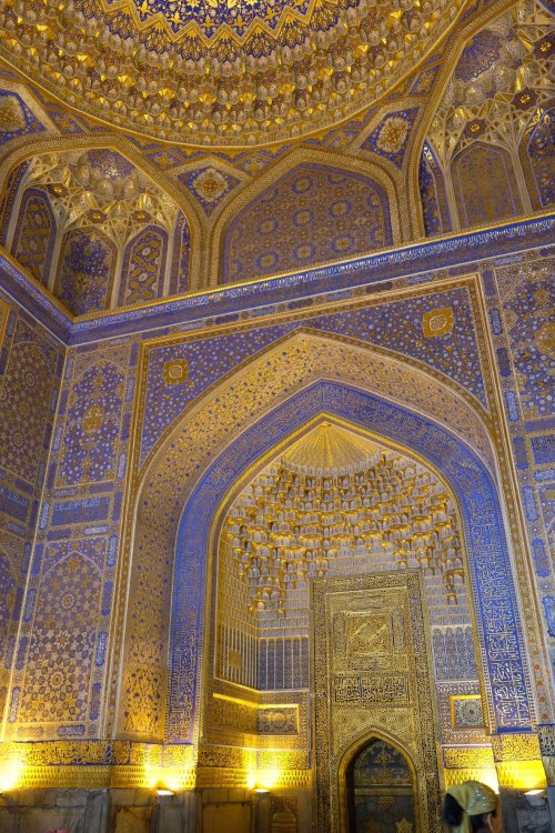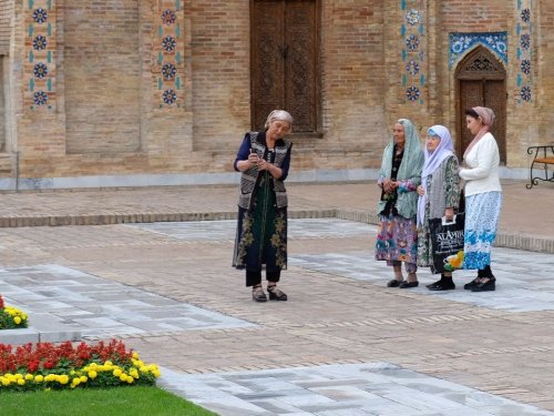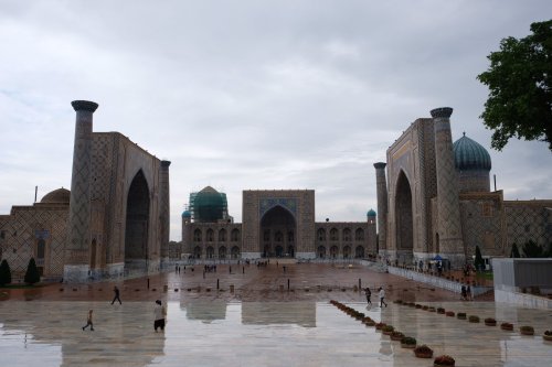 Bij het heerlijke ontbijtje (met o.a. rijstepap, mjam) ontmoeten we een Fins echtpaar dat in Frankrijk woont en met 5 (!) kinderen met de trein naar Vladivostok reist. Leuk verhaal. Samarkand is een belangrijke plaats op de oude Zijde Route en wemelt van groots erfgoed. Het regent flink en dus wachten we nog even. Met jassen aan gaan we naar de Registon, de highlight van Samarkand. Dit is een groot plein met 3 madrassah’s (koranscholen) er omheen. We nemen een enthousiaste gids die in hoog tempo kennis op ons afvuurt. Ze leidt ons ook langs allerhande souvenirwinkeltjes die in de vroegere leslokalen zitten, en dat blijkt heel interessant, We leren van alles over papier-maché, keramiek (iedere soort heeft z’n eigen geluid) en zijde (test: steek een draadje in de fik, echt zijde brandt niet). Bij de laatste verkoper moet ik uit een tafel met doeken de echte zijde kiezen, dat gaat dus niet goed, de meesten zijn nep (en branden dus). De madrassah’s zijn prachtig en de zon begint te schijnen. We laten de jassen achter in het hostel (triple A locatie naast de Registon) en lopen naar de moskee van Bibi-Khanum. Ook prachtig en authentieker zonder winkeltjes. Daarna lopen we over de bazaar en door naar de tombe van Karimov waar hele busladingen Uzbeken hun respect betuigen. We eindigen de culturele dag bij Shoh-i-Zinda een laan met allerhande prachtige mausolea. Zo, de overdosis blauwe tegeltjes is binnen. We nemen een ijsje en lopen terug door achterafstraatjes. Zo leuk, op straat worden we vaak aangesproken. Of het zijn giechelende meisjes die eerst vragen of we Engels spreken en vervolgens willen weten waar we vandaan komen en wat we van Samarkand vinden. Of het zijn jonge/oudere mannen die vragen waar we vandaan komen, hoe ze heten en dan ogenblikkelijk hun uiterste best doen om zoveel mogelijk namen van Nederlandse voetballers op te noemen. ‘s Avonds eten we bij een goed Uzbeeks restaurant (Besh Chinor) heerlijke salades, frietjes, brood en lams en kipshasliks. De tafel staat vol voor 8 Euro. De ober is een jonge economiestudent met veel charme en legt ons in detail de kaart in het Engels uit (en noemt een hele rits NL voetballers). De taxi zet ons af bij de verlichte Registon, prachtig en we nemen nog een echte cappuccino (1,50 Euro!).