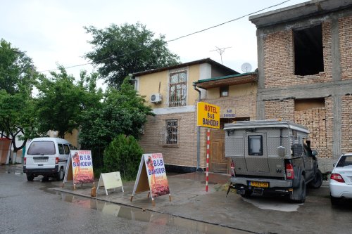 We logeren in het Green House Hostel en dat is typsich een plek om andere reizigers te ontmoeten. Het hostel zit vol, maar we kunnen op de binnenplaats parkeren en in de auto slapen. Precies wat we willen. Er zit een groep Chinezen, die geen Engels spreken maar wel erg aanwezig zijn. We ontmoeten een liftend Deens stel, een Wat oudere Belgische dame die alleen reist en een Franse fietser, die we eerder die dag bij de Anzob tunnel gepasseerd zijn. Heel gezellig om even te kletsen. We gaan Dushanbe in en drinken ergens cappuccino met gebak, bekijken het Rudaki park en shoppen wat shirtjes en kleren voor ons allebei. In de Dushanbe mall lunchen we met Lagman (een noedelschotel). Dushanbe is groen en ruim opgezet, maar helaas regent het wat. ’s Avonds eten we met de Belgische Monique bij een ‘choykana’ (theehuis) heerlijke shaslik met salades, brood en bier. Monique sipt wat van een wodkaatje en wordt heel gezellig! Dinsdag 11/6 staan we op het punt van vertrekken maar Joost stoot lelijk zijn hoofd tegen een openstaand keukenraam. Het bloedt enorm en we besluiten met de hostelmedewerker naar het ziekenhuis te gaan. Het is er vreselijk druk, maar Joost krijgt een VIP-treatment. Het is in een kwartier (nogal ruig) gehecht en we hoeven niets te betalen. Joost voelt zich verder prima, dus we slaan in in een grote Frase supermarkt. In het centrum hangen de mensen uit de auto: “ Welcome to Tadzjikistan!” of “ Welcome to Dushanbe” of gewoonweg “ Arjen Robben!” of een duim uit het raam. We rijden richting Dangara over een prima weg met goed verlichte tunnels. Vlak na Dangara stoppen we bij het monumentje langs de weg voor de 4 omgekomen fietsers. Een van de overledenen is de man van een collega van Joost van het AMC, zij was er bij overigens. Het is moeilijk voor te stellen wat hier gebeurd is, want de Tadzjieken zijn zo aardig en de weg is druk en goed. De tekst geeft aan dat de hele Tadzjiekse bevolking Familie en vrienden condoleert. We worden er emotioneel van. We vinden een rustige plek in de heuvels.
