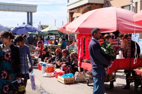 De volgende ochtend vertrekken we naar Istaravshan door de Zarafshan vallei en de uitdagende Shahkristan tunnel. Verlichting en ventilatie vinden ze hier zonde van het geld, dus je rijdt bijna 6 kilometer met kromme tenen door het duister, waar ondanks het verbod iedereen gewoon inhaalt. Het weer is prachtig, maar we kunnen geen plek vinden. Uiteindelijk rijden we op goed geluk naar het gehucht Chasmasor. Als we zoekend om ons heen kijken, stapt Abdusalatov uit zijn auto. De grijsaard dirigeer ons direct naar zijn huis waar we kunnen parkeren. We moeten thee komen drinken. Gelukkig kan ik me met Russisch een beetje verstaanbaar maken. We krijgen vers brood uit de tandoor. Als ik vraag of we de tandoor mogen zien, geeft hij ons een rondleiding door z’n huis, zeg maar een soort hoeve. Er hangt warempel een foto van de Keukenhof aan de muur (maar die tulpen zijn natuurlijk Tadzjieks!). Z’n kleinzoon (hij heeft 7 kinderen en 20 kleinkinderen) is er steeds bij, een vrolijk mannetje. We krijgen daarna een bord plov, overheerlijk, maar als we denken dat we genoeg hebben, komt er steeds meer op tafel: komkommer, noten, abrikozen, dikke yoghurt met kruiden, snoepjes, deegflapjes met uien, cake, en natuurlijk thee en kompot(vruchtensap). Hij moedigt ons herhaaldelijk aan nog meer te eten. Hij eet zelf niet mee want het is de laatste dag van de Ramadan. We weten ons om 9 uur los te rukken en gaan naar de auto. Hij zegt dat hij morgen eerst om 5 uur naar de moskee gaat en dan ons om 7 uur voor het ontbijt verwacht. We slapen uitstekend, maar Abdu is bang dat we weggaan, dus hij roept ons om 5 uur, dat we vooral om 7 uur moeten ontbijten! We trekken onze mooiste kleren aan, want vandaag is het Id-feest (suikerfeest bij ons). Voor het ontbijt krijgen we weer plov en allerhande heerlijkheden. Ik maak wat foto’s en dat vindt Abdu prachtig. Er komen steeds meer zoons bij en het lukt om met de Samsung van zijn zoons via bluetooth wat foto’s te delen. We geven hem een ansichtkaart met een bedanktekst in het Russisch en z’n kleinzoon een set kleurstiften en kleurplaten. Hij wil absoluut geen geld hebben. Hij rijdt voor ons uit naar het midden van het dorp (kan iedereen ons zien?!) en we bedanken hem uitgebreid. In Istaravshan zou een geweldig bazaar zijn, maar die is niet zo indrukwekkend. Het is erg heet en we lopen we doelloos rond.