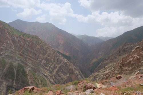 ’s Nachts barst een enorm onweer los met continue donder en bliksem, erg indrukwekkend. De harde regen verandert het parkeerterrein in een modderige boel. Al vroeg arriveren de eerste busjes met uitgelaten toeristen. Wegwezen hier. Ik pak binnen alles in en Joost buiten en zonder ontbijt gaan we rijden. Jammer, het is hier echt heel mooi, maar niet de idyllische afgelegen plek die we ons voorgesteld hadden. Als we beneden voorbij he dorp zijn gereden, houdt het op met regenen en gaan we naast de rivier even lekker eieren bakken als ‘brunch’. In Ala-Buka doen we nog wat boodschappen en dan verder naar het westen. We rijden door een prachtige kloof en net voor ons zijn er twee op elkaar gereden. De weg is best een goede gravel weg en breed genoeg, maar wel met onoverzichtelijke bochten. Als we een plek willen zoeken voor de nacht wordt dat nog best lastig in deze omgeving. Er is veel dagbouw (grint) en als we een zijweg inrijden over een klein bruggetje stuiten we op enorme graafmachines. Iets verderop rijden we langs een goudmijn. Onbegrijpelijk dat al dat materieel over dit weggetje gaat. Na een aantal pogingen is het raak en vinden we in een zijvallei een