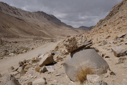 Donderdag gaan we de Barskoon vallei in. De weg erdoor is bijzonder omdat er aan het einde een goudmijn ligt en dus wordt de gravelweg werkelijk perfect onderhouden. Er rijden continu waterwagens rond om de weg nat te houden. De 29 haardspelbochten naar 4300 meter zijn uiterst ruim. Boven aangekomen wordt het landschap kaal en rotsig met gletsjers en is het 11 graden.