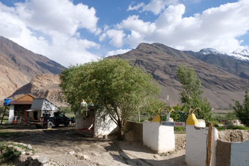 Maandag 17 juni blijven we nog een dag in Khorogh. Joost gaat op zoek naar een lasser en iemand die de afdekplaat kan snijden. Merkwaardig genoeg heeft ARB afdekplaten geleverd bij de lierbumper die aanschuren tegen een aantal onderdelen (waaronder het reservoir van de ruitenwisservloeistof) en zo schade veroorzaakt. Dat merk je pas als je lekker offroad rijdt en dat doen we. Joost spreekt iemand aan bij een bezinepomp en voor ‘ie het weet neemt iemand Joost mee naar de andere kant van de stad, blijft een uur bij hem als de lasser bezig is en brengt ‘m ook weer terug naar het guesthouse. Geweldig toch, die mensen hier? We drinken een “cappuccino” bij een plaatselijk hip café en struinen de bazaar af op zoek naar groeten, fruit, yoghurt voor de komende week. Winkelen wordt steeds lastiger hoe verder we de Pamir inkomen. We ontmoeten Jurg en Kathy bij de supermarkt en we besluiten samen bij de Indier te gaan eten. We nemen ook nog een Zweed mee die inmiddels op een Indiase motor is aangekomen (Anton & Anton, maar Anton-2 gaat niet mee). Als de Zwitserse fietser Pascal zich ook nog bij ons voegt, wordt het heel gezellig!Dinsdag rijden we vanaf Khorog de Wakhan vallei in. De Wakhan rivier scheidt Tadzjikistan van Afghanistan en op sommige plekken kun je Afghanistan bijna aanraken. De vallei is groen omgeven door sneeuw bedekte toppen (de Hindukush range). Er zijn onverwacht veel dorpjes, hoezo “remote”? Wild kamperen is dus best lastig en dus besluiten we te kamperen bij het guesthouse ‘Intisor” in Namadgut. De gastheer slaapt zelf in een lemen huisje, maar voor zijn gasten is er een echte badkamer met warm water en douche. Het uitzicht is fenomenaal. Ze zijn alleraardigst en hebben ook een shopje bij het naastgelegen fort uit de 3e eeuw v. Chr. . Als er toeristen aankomen, wordt hij geroepen en verkleedt zich razendsnel in een Afghaans kostuum. Ik kan in het Russisch een beetje communiceren met hem en z’n vrouw. Hun oudste dochter studeert in Dushanbe en de middelste spreekt prima Engels. Wat opleiding betreft, gaat het hier prima. Het alfabetisme is erg hoog en nagenoeg ieder kind gaat naar school. Het valt ons sowieso op dat Tadzjikistan goed ontwikkeld is en geen bananenland zoals wij op afstand wellicht denken. Goed om dat hier zelf te ervaren dus! De volgende ochtend wordt het snel warm. De temperatuurverschillen tussen dag en nacht zijn echt groot. Ook al is het ‘maar’ 23 graden, in de zon voelt het al snel als 30. We krijgen griesmeelpap als ontbijt (dat vind ik dus heel erg lekker) en zelfgebakken brood met eigengemaakte boter (die zo lekker is dat ik het Becel bakje leegschraap en dat volschep). We bekijken de resten van het fort Khak-Kaka en vervolgens en naastgelegen museum. Het oude mannetje legt ons ieder voorwerp uit en we zien een mooi Pamir huis waarin volgende een vaste indeling prachtig gegraveerde houten pilaren staan.