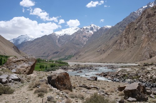 Vrijdag helpt Joost eerst Isri met z’n fiets. Daarna nemen we afscheid en gaan op pad. De weg wordt iets beter en de vallei is spectaculair. Hier dankt de Pamir Highway z’n reputatie aan, niet de kwaliteit van het wegdek! Het weggetje aan de Afghaanse kant is indrukwekkend, soms hangt het pad aan de rotsen. Rond de middag komen we aan in Rushon en kopen een broodje en vullen water bij langs de kant van de weg (hier zijn over bronnen te vinden). Vuilnis weggooien is hier een hele kunst, afvalbakken zijn schaars. We rijden de Bartang vallei in. De Bartang komt uit in de Panj rivier. De vallei is smal en rotsig, toch anders van karakter en erg rustig. We stoppen bij een homestay, maar er is niemand te bekennen. Dan toch naar die ‘amazing’ wildplek. En inderdaad een prachtig groen grasveldje met bomen en een waterbron, en zelfs een betonnen brug om onder je auto te kijken. Er staan twee minibusjes met scholieren en ze hebben pech. De accu is leeg en ze hebben een lege band. Joost helpt ze met de compressor. Ze blijven nog lang hangen, want er moet blijkbaar van ver een accu worden gehaald. Uiteindelijk zijn we helemaal alleen. We eten wat en douchen alletwee onder de douchezak aan de moerbeiboom.