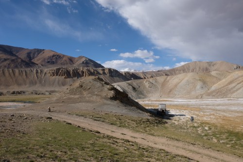 Door de zon branden we snel de tent uit en rijden we richting Alichur over een track langs meren, yaks en roodstaartmarmotten. Wat een geweldige tocht. Alichur blijkt niet veel te zijn en dus rijden we oostwaarts over de Pamir Highway ri. Murghab. Wederom een slechte asfaltweg met gaten (max. 50 km/u). We besluiten toch nog een nachtje wild te kamperen in een vallei. Achter een rots staan we redelijk beschut. Op 3800 meter is het adem happen en lastig slapen, dat wel, maar de omgeving maakt veel goed en het is oorverdovend stil.