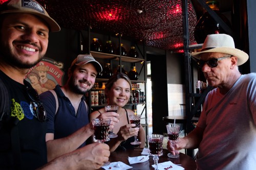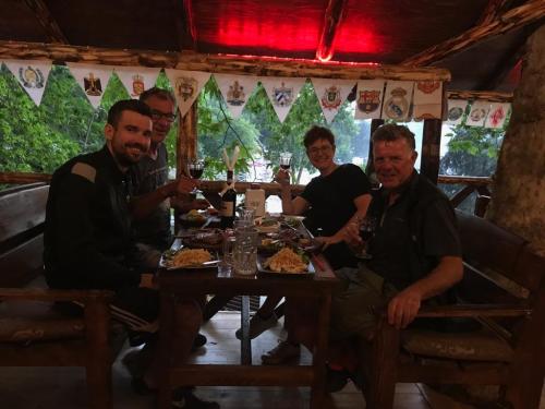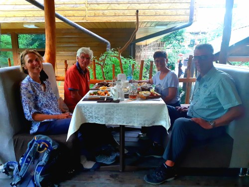 Donderdag ontbijten we traag, wisselen nog wat ervaringen uit met de Duitsers (Hilux, MAN truck en Hymer camper) en vertrekken richting Osh. Osh is de tweede grootste stad van Kirgizië met 250.000 inwoners en we hebben wel zin in lekker uit eten en even wat anders. Onderweg laten we de auto grondig wassen, want de rode modder zit tot aan het raam. We vinden een plek bij het Apple hostel, waar ook een Belgisch VW-busje staat. We gaan de stad in en kopen een autoverzekering bij een dame die prima Engels spreekt, en daarna bij de Beeline 2 sim-kaarten (joehoe, 4g!). We drinken wat lekkers bij het Ice cafe en ik Whatsapp met Wendy die 150 km verderop zitten, waar we het beste kunnen gaan eten. We missen Wendy en Wilchard echt op een haar en dat is jammer! We gaan zitten bij Tsarskii Dvor, een bekende eterij. We hebben net een aperitief besteld of via Polarsteps hebben we contact met Koen en Daan: ze zitten in hetzelfde restaurant! Joost zoekt ze op en het wordt en reuze gezellige avond met veel vlees en te veel Georgische rode wijn. Top. Wat een bikkels, die mannen. We nemen een taxi naar ‘huis’.