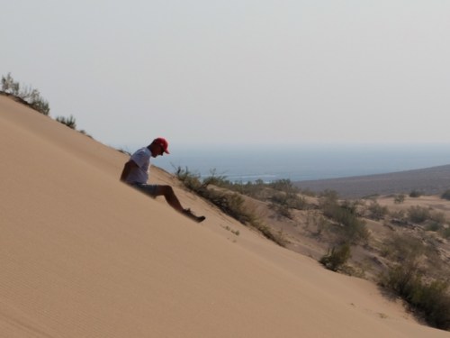 Dinsdag rijden we door richting National Park Altyn Emel. Het is een flinke rit, maar het wordt wat sneller als we ineens op de nieuwe zijderoute blijken te zitten (4 baans asfaltgenot). Helaas maak ik een klein foutje en dan ben je niet even zomaar gedraaid met zo weinig afritten! De rest van de weg is gelukkig ook goed dus rond een uur of 3 melden we ons bij het permit-office, waar we een permit en kampeervergunning kopen voor het NP. OP weg naar het eerste ranger station spot Joost twee gazelles (jieran). In dit enorme park (460.000 ha) schijnen er 6000 te zijn, maar hier blijft het bij en daar mogen we al blij mee zijn. Einde van de middag komen we aan bij de singingdunes. Het is 38 graden maar ja, je hoort wel naar boven te klimmen! Stapje voor stapje met een groep Italiaanse toeristen naar boven (ik bijna…) en dan gaat Joost op z’n kont naar beneden. Dat gaat niet zo hard, maar je hoort dan wel het lage brommende geluid, dat ze zingen noemen. Met hard naar beneden lopen, lukt het ook. Grappig, maar wel overal zand dus. Terug bij het 2erangerstation gaan we onder een paar gigantische wilgen in de schaduw staan en nemen een biertje. Als snel komen er meer mensen waaronder ook twee Belgen met een gids. Die installeren zich voor de zonsondergang dus we komen er gezellig bij. De een is decaan van de fysiotherapie-faculteit in Hasselt en de ander heeft een boeiende baan bij de WHO. Ze tutten wel een beetje en roepen steeds dat ze niet weten hoe ze moeten kamperen! Ze zijn een week in Kazachstan, hoe bedenk je het, met een overvol programma zo te horen. ’s Avonds koelt het wel lekker af.