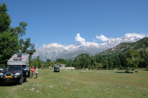 Uiteindelijk besluiten we flink boodschappen te doen. We kijken nog even bij het fort (en zien de Fransen weer) en proberen te pinnen, maar 4 ATM’s doen het niet. Lekker de bergen in is ons idee! In Aini doet de geldautomaat het wel. Als we even stoppen, ziet Joost tot zijn schrik dat de mof om de aandrijfas los is gegaan en de wielkas zit onder de olie. Langs de weg gaat de overall aan en de auto op twee krikpotjes. Het lukt om een tiewrap om de mof te krijgen. Een losse mof kan allerhande grote ellende veroorzaken als je offroad rijdt, dus we rijden door naar Dushanbe (hoofdstad).Opmerkelijk: er stopt maar 1 auto om hulp aan te bieden en dat is nogal in tegenstelling met hoe we de Tadzjieken hebben leren kennen. Deze omweg betekent wel dat we 3 keer door de gevreesde Anzob-tunnel moeten (de ‘tunnel of death’). Ach, het is iets enger dan de Shakristan tunnel. En gelukkig is het rustig vanwege het suikerfeest. De omgeving is absoluut ‘stunning’. Onderweg boek ik een kamer in Hostel Latifa waar de auto binnen kan staan. Het is er best gezellig, maar de bedden zijn werkelijk keihard. Na een prima ontbijtje gaan we vroeg naar de Toyota-garage. We boffen dat die open is ondanks het feest. Ze spreken in Tadzjikistan veel meer Engels dan in de voorgaande landen, dus de communicatie gaat prima en het wordt vakkundig gerepareerd. Opmerkelijk is wel dat je, in tegenstelling tot Nederland, niet overladen wordt met koffie, zelfs geen water. Na twee uur is het gepiept en het komt werkelijk met sloten de hemel uit (met onweer). Rond 12 uur gaan we weer terug naar waar we gebleven waren en dus weer door de Anzob tunnel. Nu rijden we achter een van de oranje kiepwagens aan, die af en aan door de tunnel gaan. Dat rijdt een stuk relaxter. We slaan de onverharde weg naar Lake Alaudin in. Het is ‘maar’ 28 kilometer (uiteindelijk doen we er 3 uur over). We gaan eerst door een aantal kleine dorpjes en de kindertjes zwaaien enthousiast. De weg wordt smaller en uitdagender met meer rotsen en gravel. Na het spannendste stuk komen we aan bij een aantal weilandjes in een prachtig dal. Het is er behoorlijk modderig. We zoeken een plekje aan de rivier en zijn de koning te rijk. Heerlijk weer en een superplek. ’s Nachts wordt het echt koud op 2300 meter en maken we een vuur. De volgende dag staat een boer mest te strooien in het weiland. We zien eerlijk geen gewas staan of iets dergelijks. Ik maak een praatje met de man in het Russisch. Hij is heel aardig, maar we voelen ons toch wat opgelaten. We ruimen het vuur zorgvuldig op en rijden door. Ik dacht dat de weg nog enger zou worden maar dat valt reuze mee. Wel smal en veel modder en wat rivierdoorsteekjes. Het is werkelijk prachtig met al die witte toppen om ons heen en een groene vallei. De weg eindigt in het ‘basecamp’ Alaudin. Een soort camping, maar dan zonder voorzieningen. De Fransen die we eerder bij de Seven Lakes zagen, zien we vertrekken. We installeren ons in de zon en gaan op pad naar Lake Alaudin. Een wandeling van 45 minuten. Het meer is inderdaad bijzonder blauw en we ontmoeten er een Indonesisch (met gids en auto) en een Oekraïens stel (liftend). Terug op de camping staat er een grote groep klimmers uit Moskou en een gids met een Pools stel. Wat is het hier ineens druk! Helaas betrekt het weer en wordt het serieus koud. We trekken ons terug in de auto en gaan vroeg slapen.