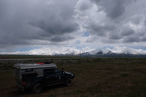 We nemen afscheid van Elvira en haar gezin, ze bedanken ons uitgebreid. Hier word je heel nederig van, zoals mensen hier leven. Bij het meer komen we een Duits fietsend echtpaar tegen, knap hoor. We gaan nog twee passen over van ruim 4000 meter. De zon schijnt en het ziet er allemaal indrukwekkend uit. Vlak voor de Tadzjiekse grens wordt de weg echt vreselijk. Flinke potholes en bij de douane is het een grote modderpoel. We ontmoeten Daniel en Mark die met een gehuurde Patrol aan het rondrijden zijn. Heel dapper, want er is echt vanalles mis met de auto. Daniel heeft net 3 maanden zijn rijbewijs en begint volgens week als arts (het boek Acute geneeskunde ligt op de voorstoel). Ze hebben er wel lol in, ondanks de kapotte startmotor en continue bezinedamp waar ze in rijden. Ze hebben permanent een steen in de auto omdat de handrem het niet doet. Geniaal. Prettig dus dat we samen het beruchte niemandsland kunnen doorrijden. Tussen de grens van Tadzjikistan en Kirgizië ligt tientallen kilometers niemandsland en de weg is berucht steil, slecht onderhouden en nu ook modderig. Gelukkig gaan we van boven naar beneden, want andersom had ik niet graag gedaan. De douane is aan beide kanten prima te doen en de Kirgiezen kijken niet eens in de auto. Wel helpen we nog even een gestrande Letse motorrijder met starten. Het landschap aan de andere kant is wonderwel anders. Gras, paarden, yurts en ….. warmer! De besneeuwde toppen aan de horizon zijn prachtig. We wisselen wat Dollars en Somoni bij een benzinepomp en eindigen de dag in een alpenweidje naast 3 Duitse overlanders. Heerlijk even zitten in het zonnetje. Helaas begint het snel te onweren en hard te waaien. We draaien de auto in de wind en eten in de auto. Slapen gaat fantastisch in deze temperatuur!