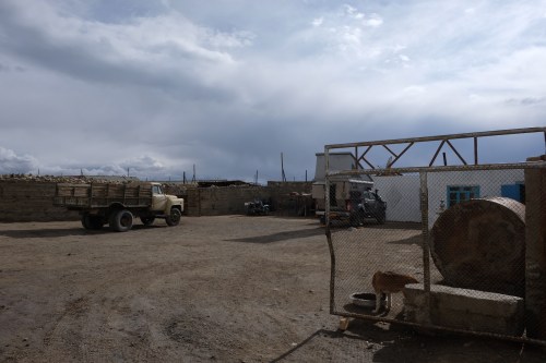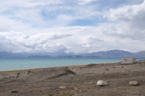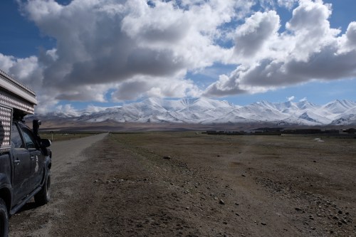 We ontbijten samen, wisselen nog wat info uit en gaan diesel tanken en naar de container bazaar. Nu een stuk levendiger dan gisteren. We nemen afscheid maar gaan elkaar vast nog tegenkomen in Kirgizië. Ons plan is om eerst naar de zoutmeren bij Rangkul te rijden. Als we er aan komen, is het weer erg guur, het sneeuwt en de weg een stevig wasbord. Geen zoutmeer te zien, wel wat meren met hoge Chinese bergen op de achtergrond. Nodigt niet uit om rond te blijven hangen. We vervolgen de Pamir Highway naar het noorden. We gaan dan de beruchte Ak-Baital pas over van 4600 meter. De auto heeft het zwaar, want met deze hoogte verdwijnt de trekkracht en komt de turbo maar moeilijk in actie. En dan is de weg ook nog nat en modderig. Ongelofelijk dat diverse fietsers dit ook doen, petje af! Na de pas volgt weer een onwerkelijk landschap, een brede vallei met hoge pieken. We hadden bedacht de Bartang vallei aan de oostkant in te rijden. Als we bij de afslag aankomen is de track bedekt met sneeuw. Met de verhalen van vastzittende auto’s in ons achterhoofd en een kapotte standkachel, hebben we daar geen trek in. We komen aan bij het enorme Karakul meer. Het is een prachtig gezicht, zo’n blauw meer met besneeuwde toppen rondom. We rijden het dorpje in op zoek naar een plek om beschut te overnachten. Als we even stilstaan komt er een jonge vrouw op ons af en probeert ons in het Engels te overtuigen dat we vooral bij haar moeten komen. Dan doen we dan maar en ze is er zichtbaar erg blij mee. Het is een zeer eenvoudige homestay, waarbij je in een kamer van de familie kunt overnachten. Wij kiezen ervoor in de auto te slapen maar wel gebruik te maken van diner en ontbijt. Het toilet blijkt een meerpersoons gat in de grond te zijn zonder dak er boven. Voordeel: je ruikt er niets van, nadeel: je wordt nat als het sneeuwt of regent, en je zit altijd naar andermans productie te kijken, boeiend. Afijn, we doen het er mee voor het bedrag van 10 Euro totaal. Er lopen twee kleine kindjes rond, waar ik mee probeer te spelen. Verstoppertje doet het goed bij het wat oudere jongetje. Joost probeert intussen de kachel te resetten (daarvoor moet alles uit de bakken ;-( ). Het werkt helaas niet. In de zon is de temperatuur nog te doen en we lopen een klein rondje. Het is een troosteloos dorp, waar de hoeveelheid drogende koeienvlaaien verraadt dat er veel gestookt moet worden tegen de kou. Als ik met de kindjes op straat sta, komt er pruttelend een Lada met een familie tot stilstand. De kindjes zwaaien naar mij en de vader stapt achteloos uit met een fles slaolie in de hand, lijkt het. Hij giet het in de brandstoftank en verder gaat het spul. Iconisch. De jongens uit het dorp komen in groepjes langs om de auto te bekijken.