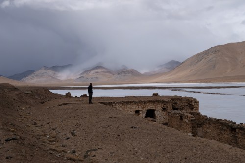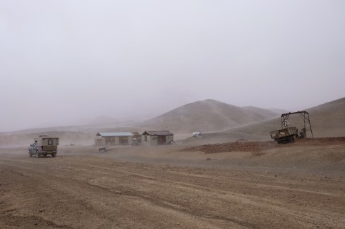 Maandag 24 juni besluiten we naar Jarty Gumbez te rijden in het zuidoosten van de Pamir. Tot daar is de weg te doen. Van daaruit naar Zorkul wordt afgeraden, omdat er auto’s zijn vast komen te zitten in de modder. We zijn Murghab nog niet uit en staan bij het checkpoint of ik ontvang een bericht van Daan en Clarine. Ze hebben onze paalpost ontvangen! En we kunnen vanavond afspreken in Murghab. Leuk. Aangezien het toch koud is, regent en af en toe sneeuwt, korten we onze plannen in. We rijden naar een oud Sovjet observatorium in de Karasu vallei (waar we eerder hebben overnacht). De mist hangt laag en dat maakt alles mysterieus. We komen 1 Kroatische motorrijder tegen die aangeeft dat het verlaten basecamp van het observatorium eruit ziet als een scene uit een Mad Max film. En inderdaad, lege houten barakken met een kapotte vrachtwagen en hier en daar kleidingstukken en hoorns van Marco Polo schapen. Met de sneeuw en mist erbij best een beetje ‘creepy’. We eten snel wat uit de wind en verbazen ons weer over hoe verschillend van kleur en textuur rotsen kunnen zijn. Om 15 uur zijn we terug in het Pamir Hotel en niet veel later arriveren Daan en Clarine. We hebben elkaar veel te vertellen, dus het wordt gezellig en na een warme douche eten we samen. De volgende dag ligt er een dun laagje sneeuw op de auto’s maar al snel komt de zon er door en is het weg.